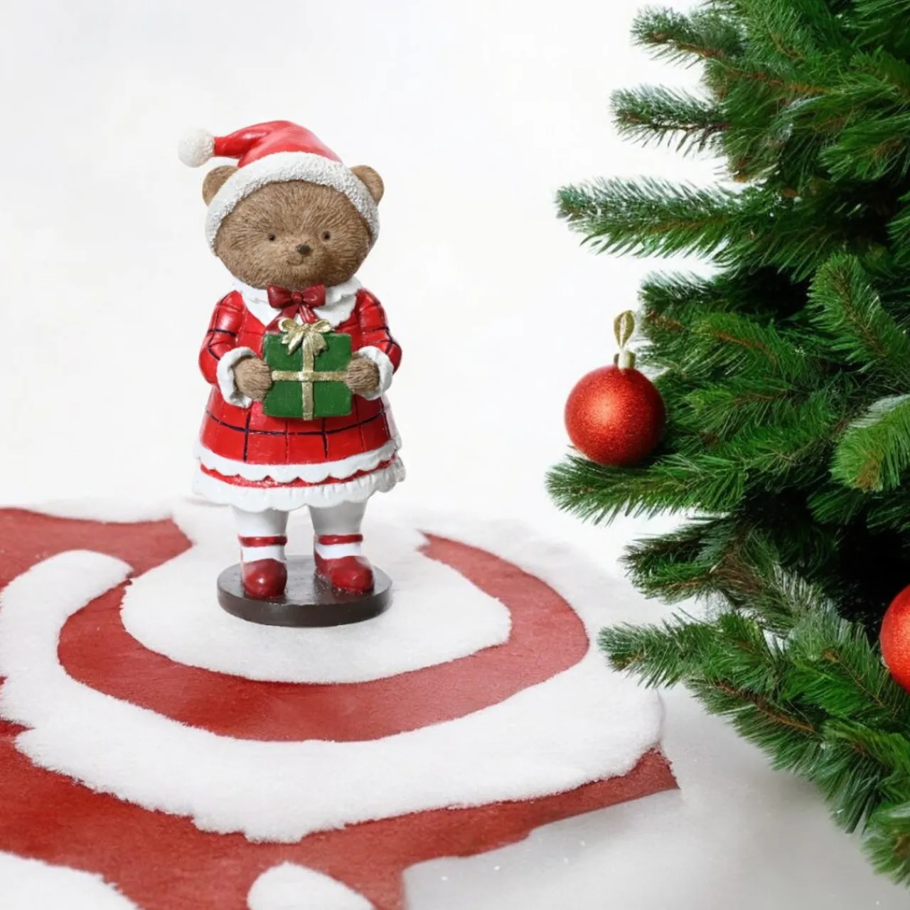 Add a touch of festive charm to your holiday decor with this adorable bear in a red dress figurine. This cute bear is crafted from high-quality polyresin. Dressed in a delightful red dress and holding a green present, this figurine is perfect for adding a whimsical touch to your mantel, shelf, or tabletop display. Bring holiday cheer and joy to your home with this charming bear figurine.