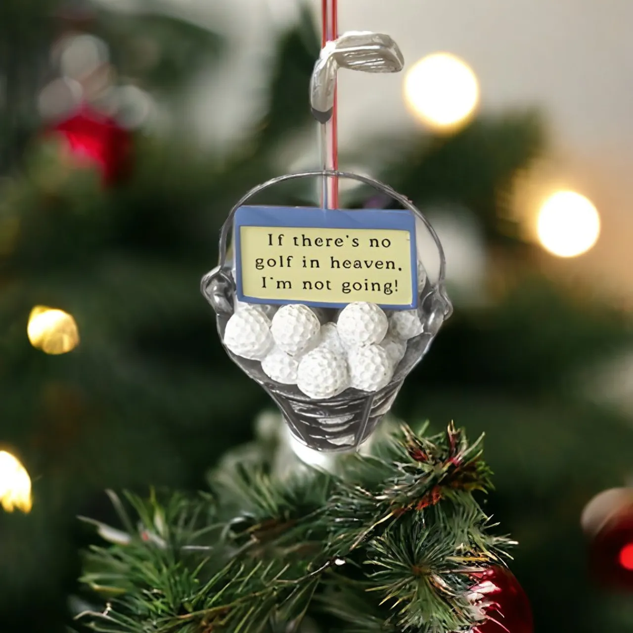 The Ganz “No Golf in Heaven” ornament humorously declares, “If there’s no golf in heaven, I’m not going!” Crafted with a playful spirit, this ornament features a bucket filled with golf balls and a golf club, capturing the essence of a golfer’s dedication.