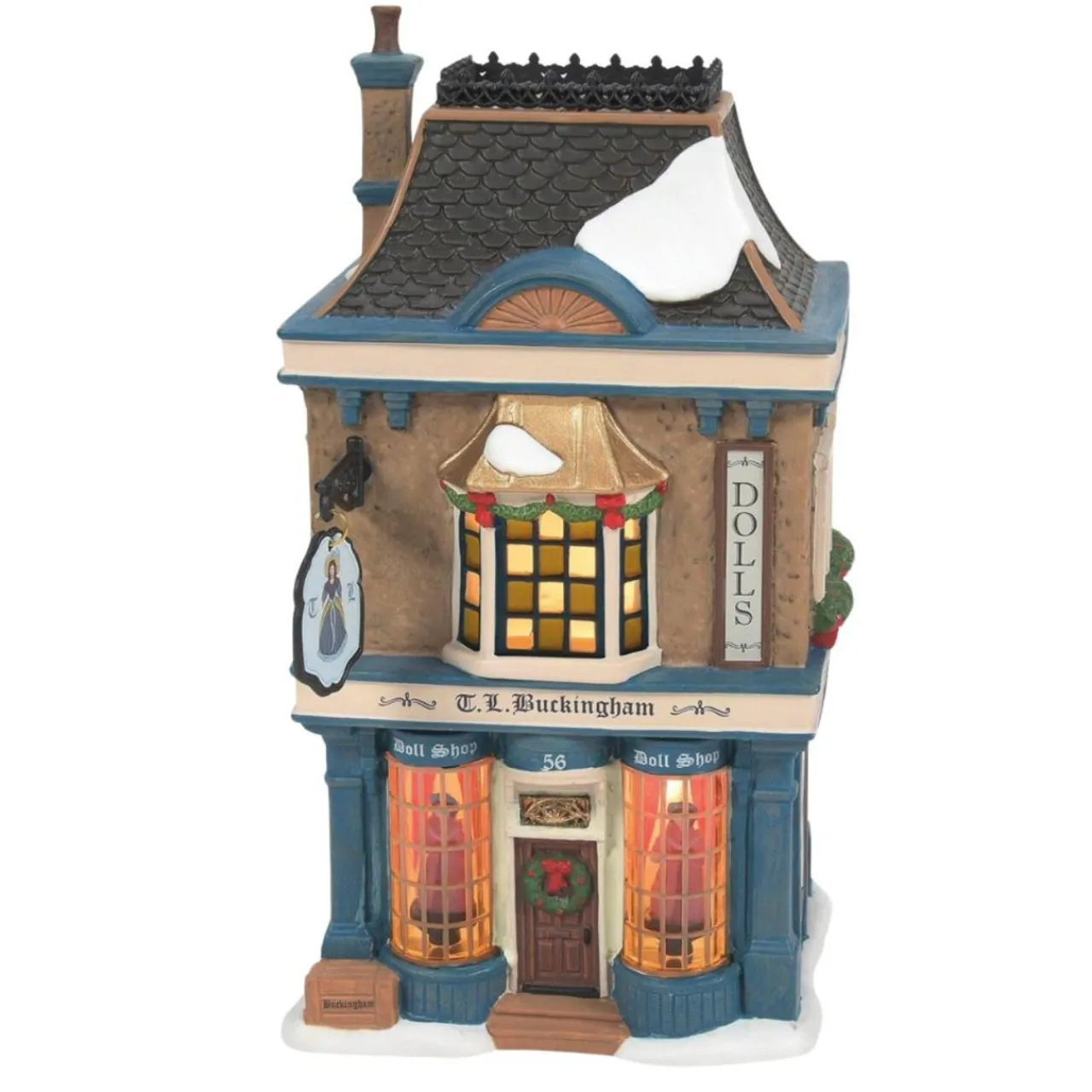 Step back in time with the TL Buckingham Doll Shop from Department 56’s Dickens Village collection. This charming porcelain piece showcases exquisite Victorian architecture, complete with snow-covered details and warm-lit windows.