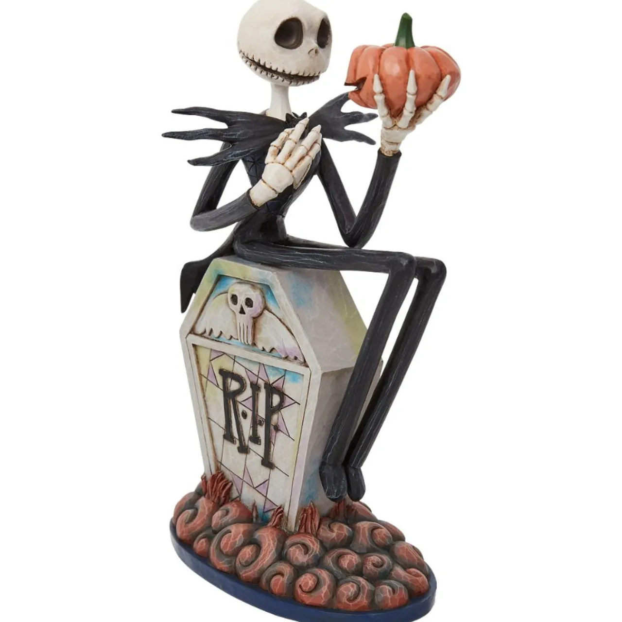 Sitting atop a tombstone, Jack Skellington has a To Be Or Not To Be moment with a jack-o-lantern. Eye to eye, he holds a pumpkin much like a skull and contemplates all things Halloween.