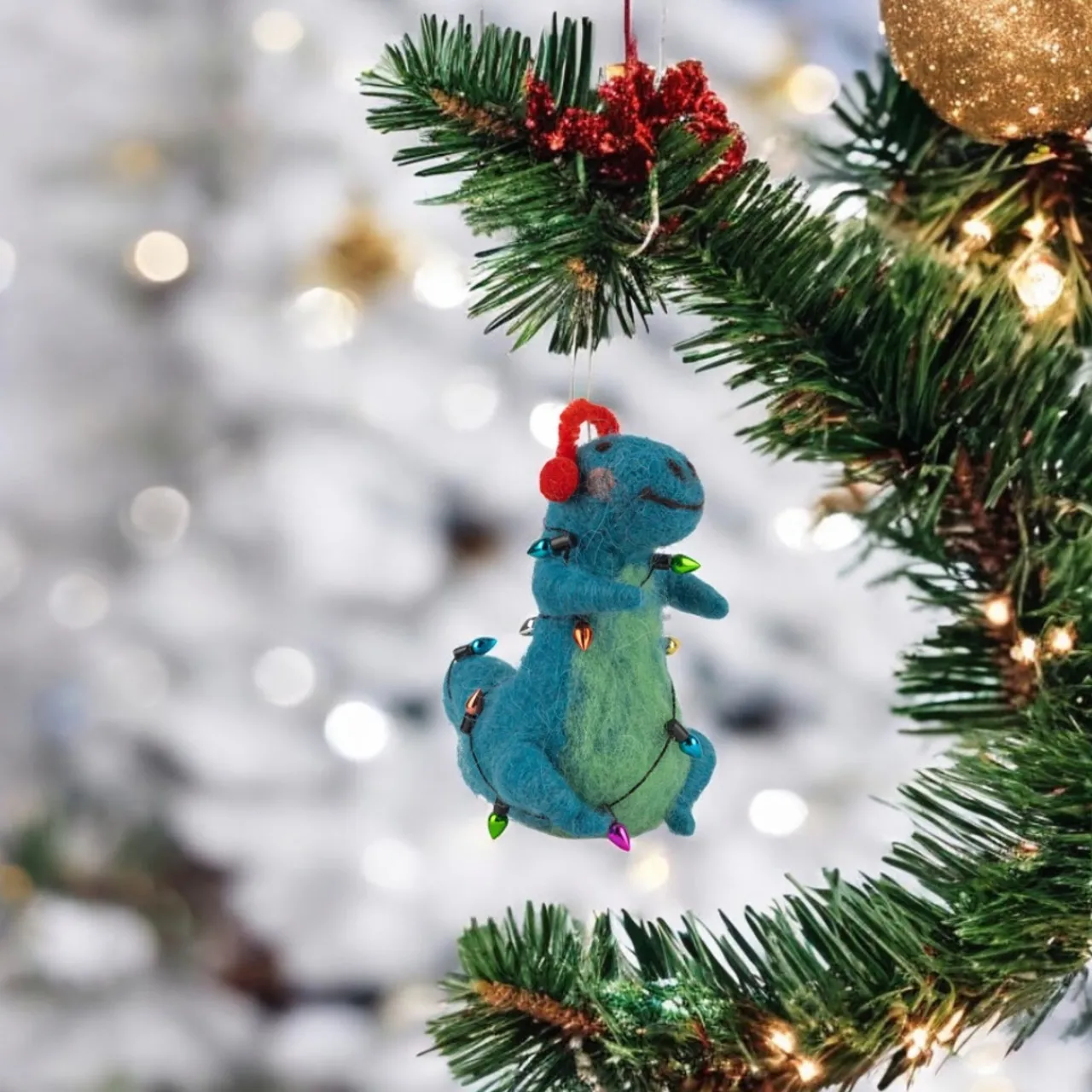 This playful blue and green felt dinosaur is bundled in a string of vibrant holiday lights and cozy red earmuffs, bringing festive cheer to any tree. Made with care, this quirky ornament is perfect for dinosaur lovers of all ages.