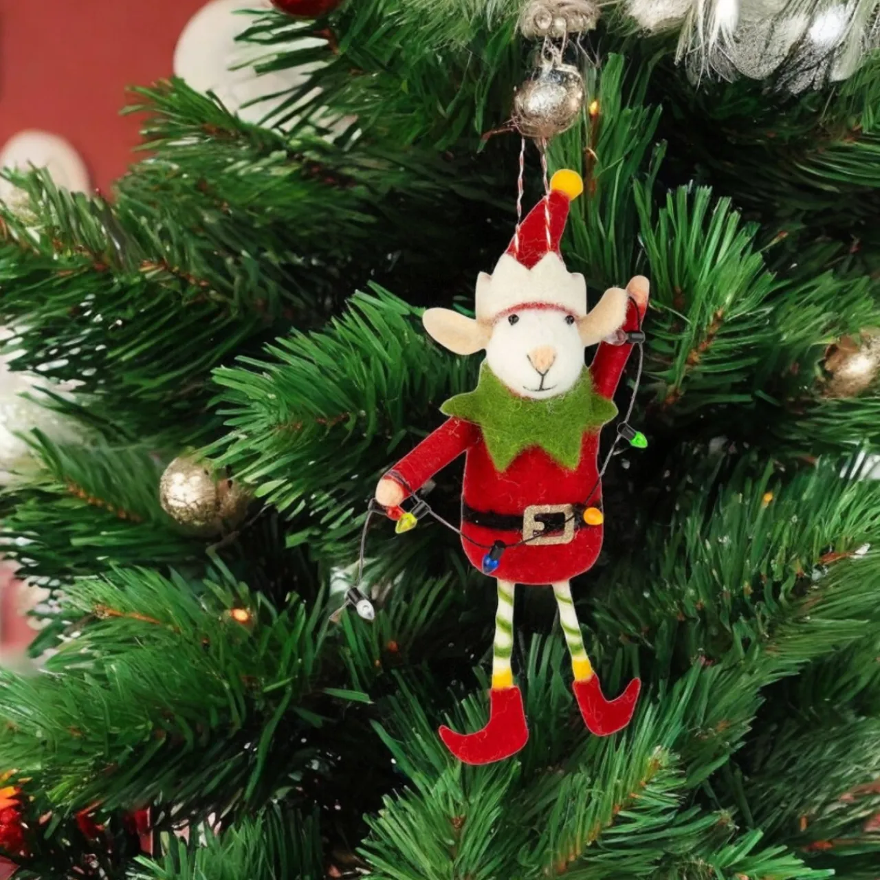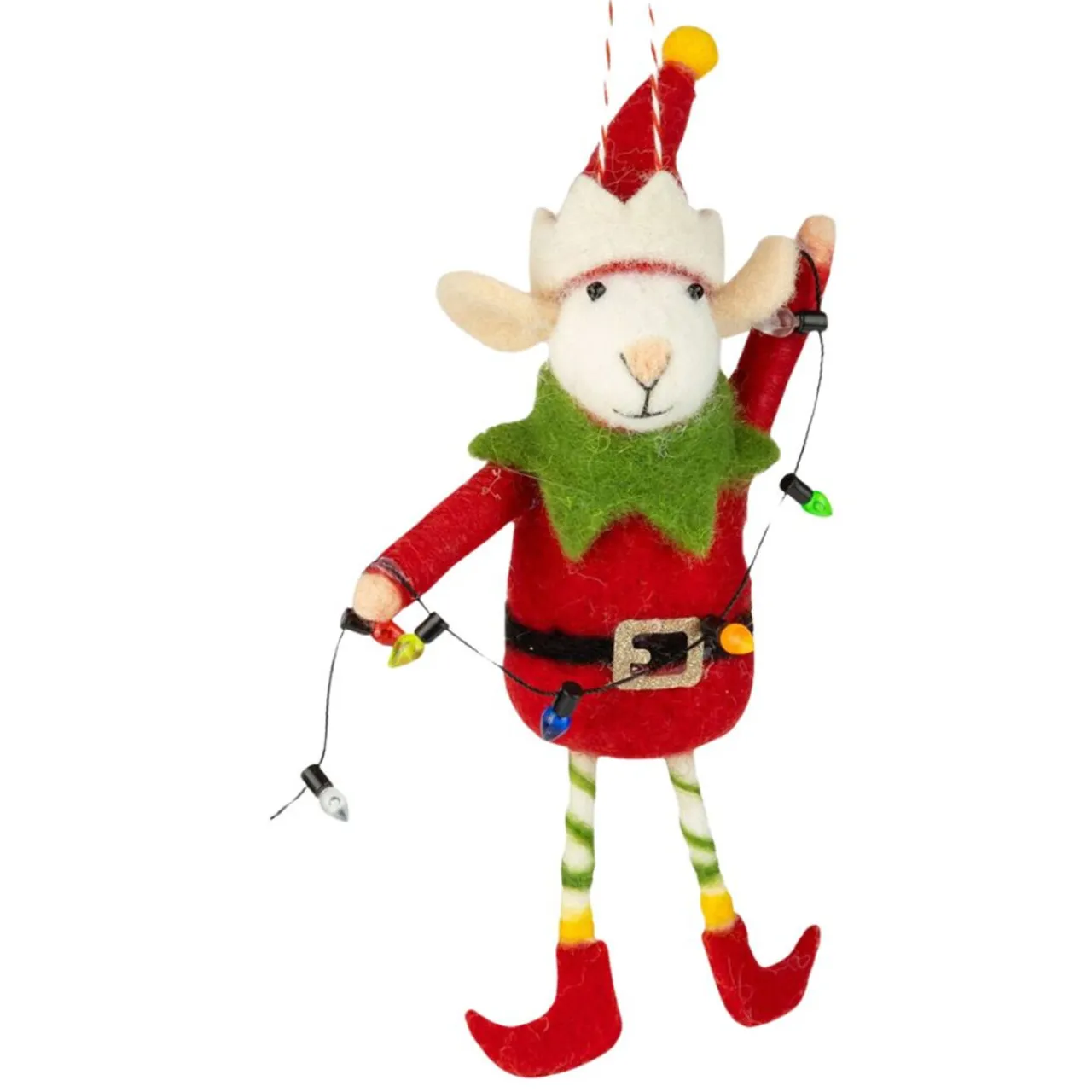 Brighten your holidays with this Felt Elf Mouse in Red Suit Holding Christmas Lights Ornament! This cheerful handcrafted mouse wears a festive red suit, a green collar, striped leggings, and a jaunty elf hat.