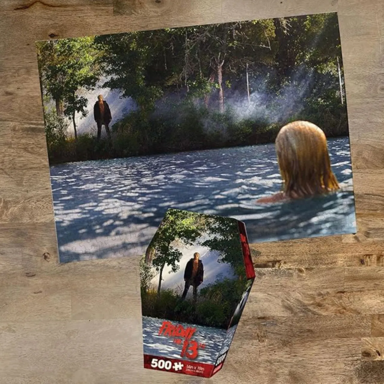 Enter the eerie world of Camp Crystal Lake with this 500-piece Friday the 13th puzzle, presented in a unique coffin-shaped box. Featuring the haunting image of Jason Voorhees by the water’s edge, this 14×19 inch puzzle is a thrilling challenge for horror fans.