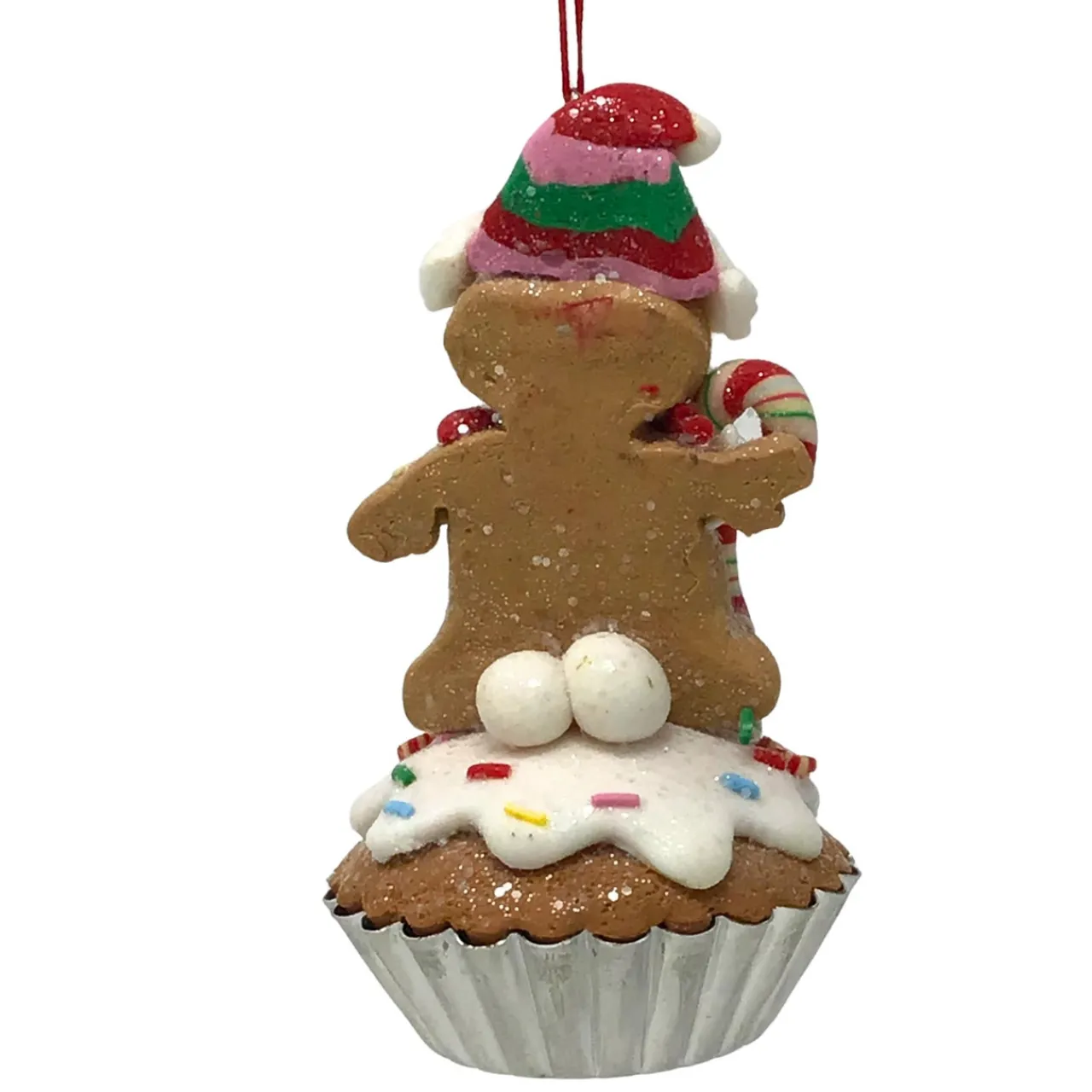 Introducing the festive and oh-so-cute Gingerbread Man Cupcake Christmas ornament, complete with a candy cane held tightly in his little icing-covered hand! Made with the finest gingerbread spices and topped with creamy vanilla frosting, this cupcake will have you feeling like a kid on Christmas morning. So go ahead and indulge in the whimsical delight of the Gingerbread Man Cupcake, and let the holiday magic take over!