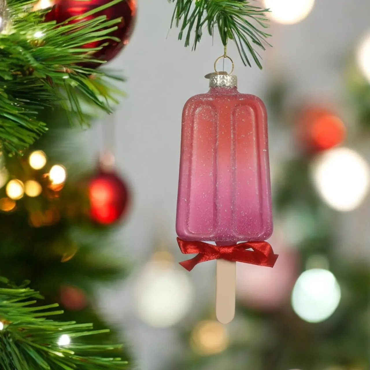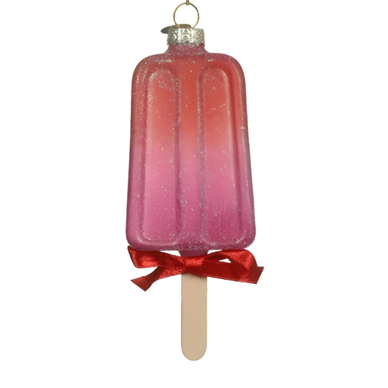 Add a sweet touch to your holiday decor with this adorable Glass Popsicle Ornament! Measuring 4.7 inches tall, it features a glittery finish and a charming red ribbon.