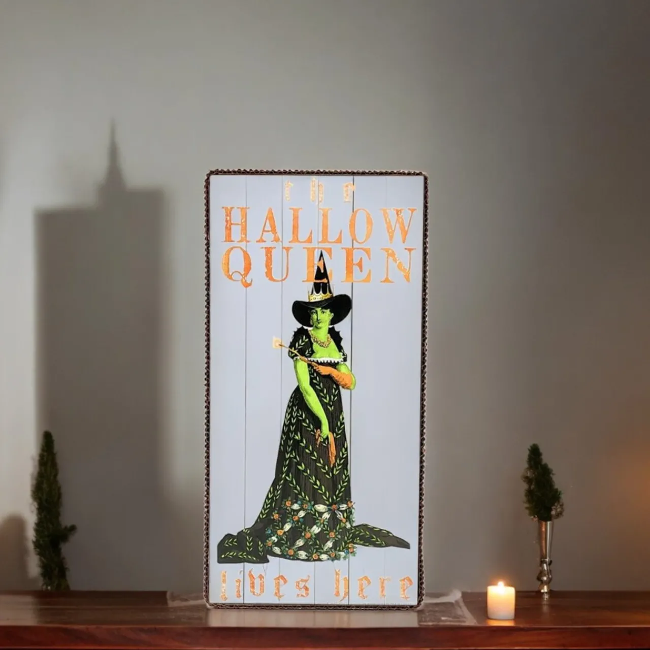Celebrate the queen of Halloween with the 12″ Hallow Queen Witch Block. This stylish decoration features a regal witch in a flowing dress, holding a magical wand. Perfect for adding a touch of vintage charm to your Halloween decor, this wooden block can be displayed on shelves, mantels, or as part of a festive centerpiece.