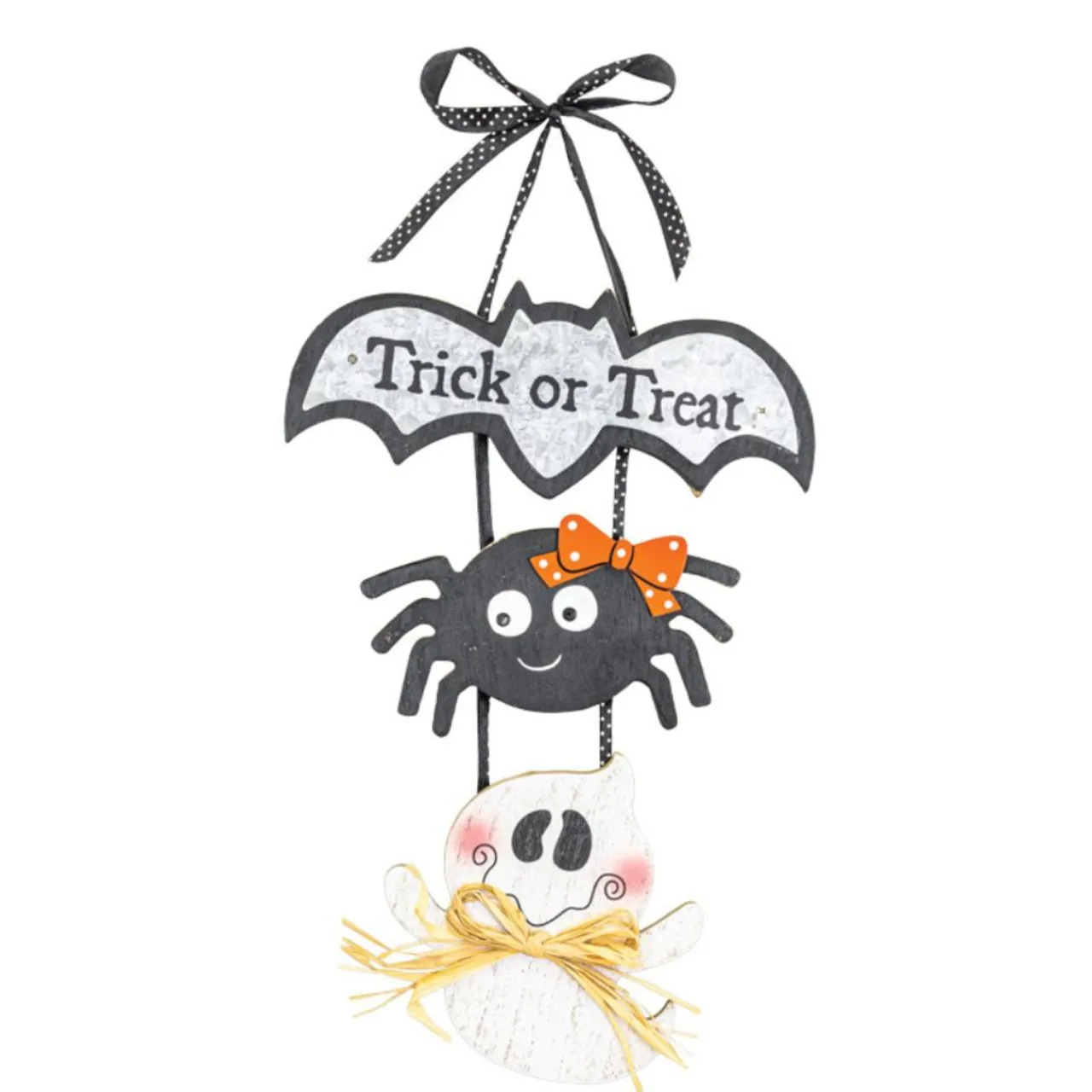 This fun Halloween wall hanger featuring a bat, spider, and ghost combines spooky and cute while letting people know you are ready for trick or treaters.
