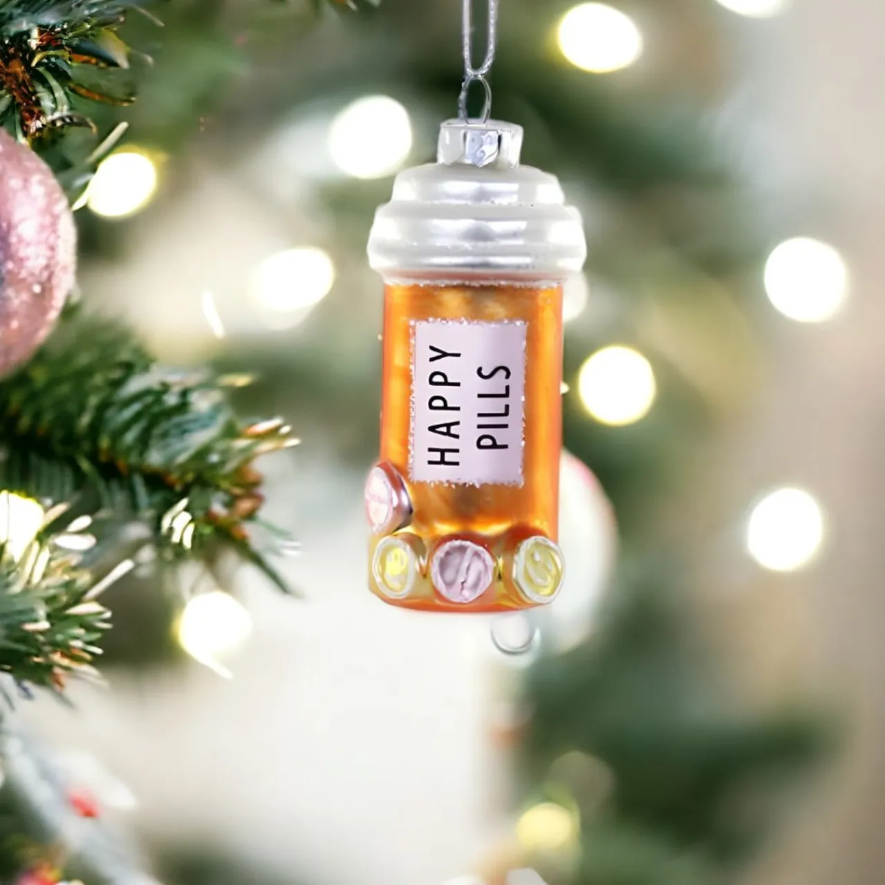 Inject a dose of cheer into your holiday decor with Cody Foster’s ‘Happy Pills’ Bottle Ornament. This charming, glass-blown prescription for fun hangs playfully from your tree, filled with colorful candy-like capsules.