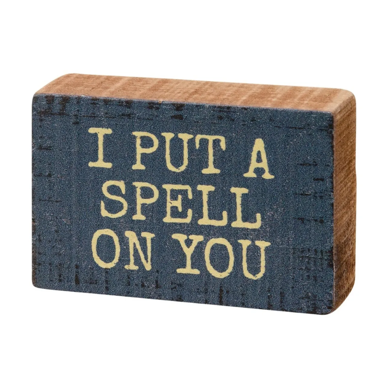 Cast a charming aura in your space with our I Put A Spell On You Wooden Block Sign. Distinctive burlap canvas art replication on a textured background captures the mystical vibe, ideal for seasonal decor or a whimsical touch year-round. Conveniently designed for wall hanging or free-standing display. Enhance your home with this enchanting piece!