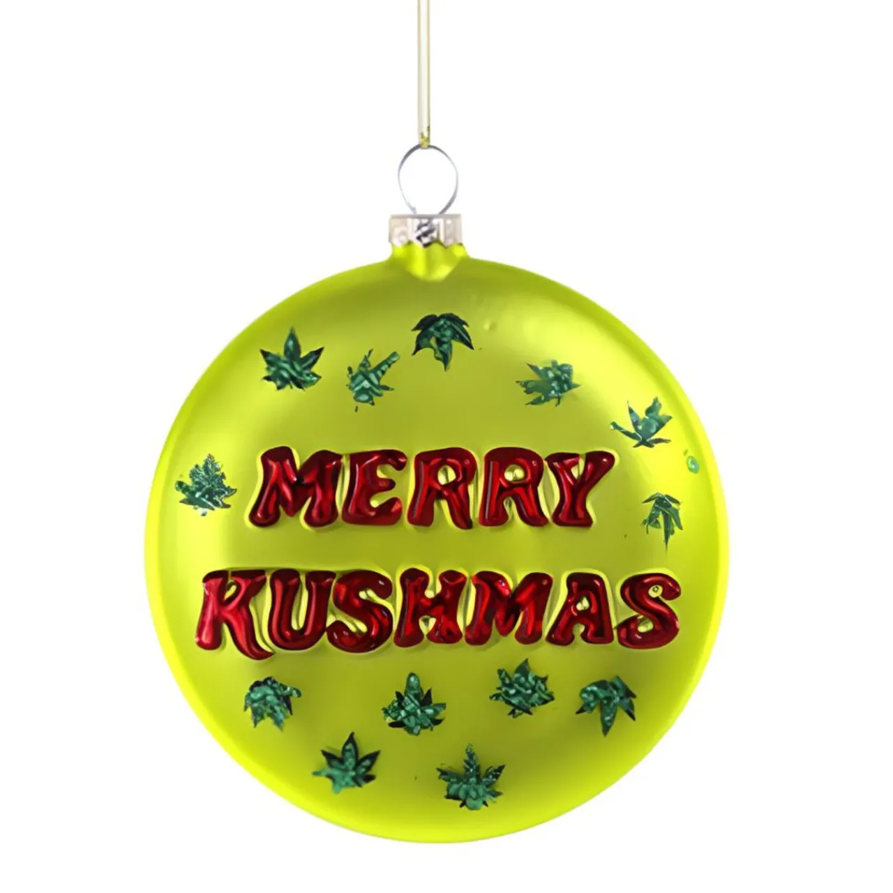 Celebrate the season uniquely with Cody Foster’s Merry Kushmas Christmas Ornament. This vibrant yellow bauble features playful green cannabis leaf motifs and festive red “Merry Kushmas” text, adding a cheeky twist to traditional holiday decor.