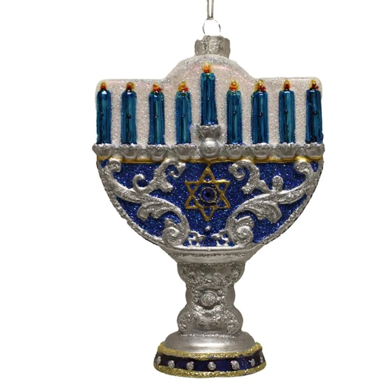 Noble Gems is a collection of beautiful glass ornaments celebrating different occasions, meant to last year after year so that you could preserve and reflect upon your memories each holiday season. Each ornament is an intricate work of art that is sure to be treasured. This Noble Gems “Happy Hanukkah” lights ornament is a beautiful addition to your Hanukkah decor. It features the traditional colors of Hanukkah with glittered accents.