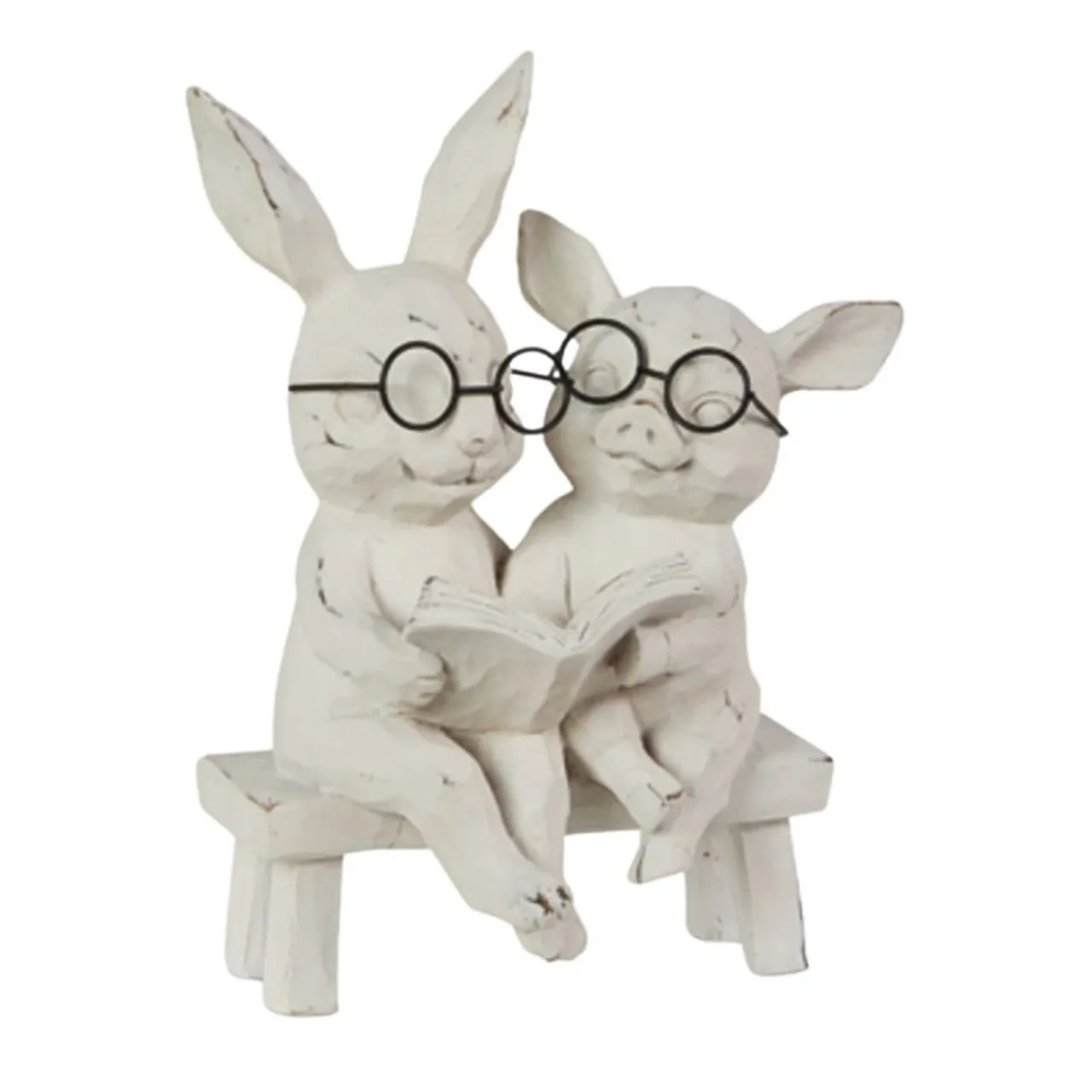 This Reading Bunny & Pig on Bench figurine captures the charm of two studious friends sharing a story. Made from resin with a vintage whitewashed finish, this adorable duo wears tiny round glasses as they enjoy their book together.