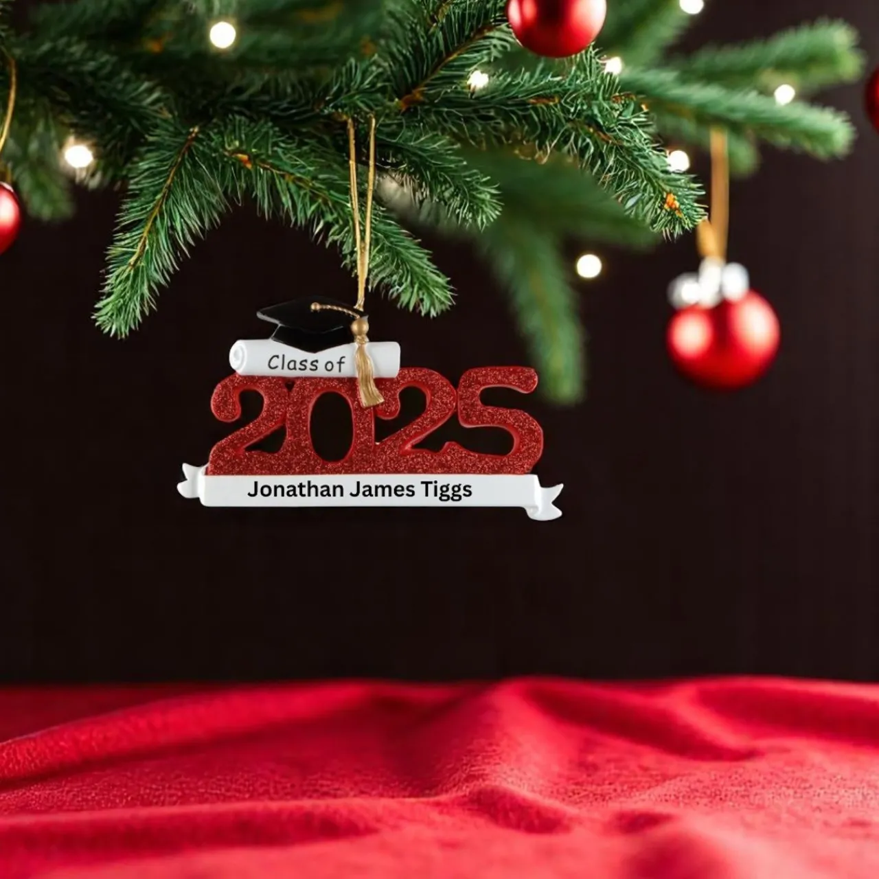 Celebrate the graduate in your life with our Red Class of 2025 Graduation Personalized Ornament! Featuring bold glittery red numbers, a diploma scroll, and a classic black cap with golden tassel, this cheerful keepsake is perfect for any proud grad.