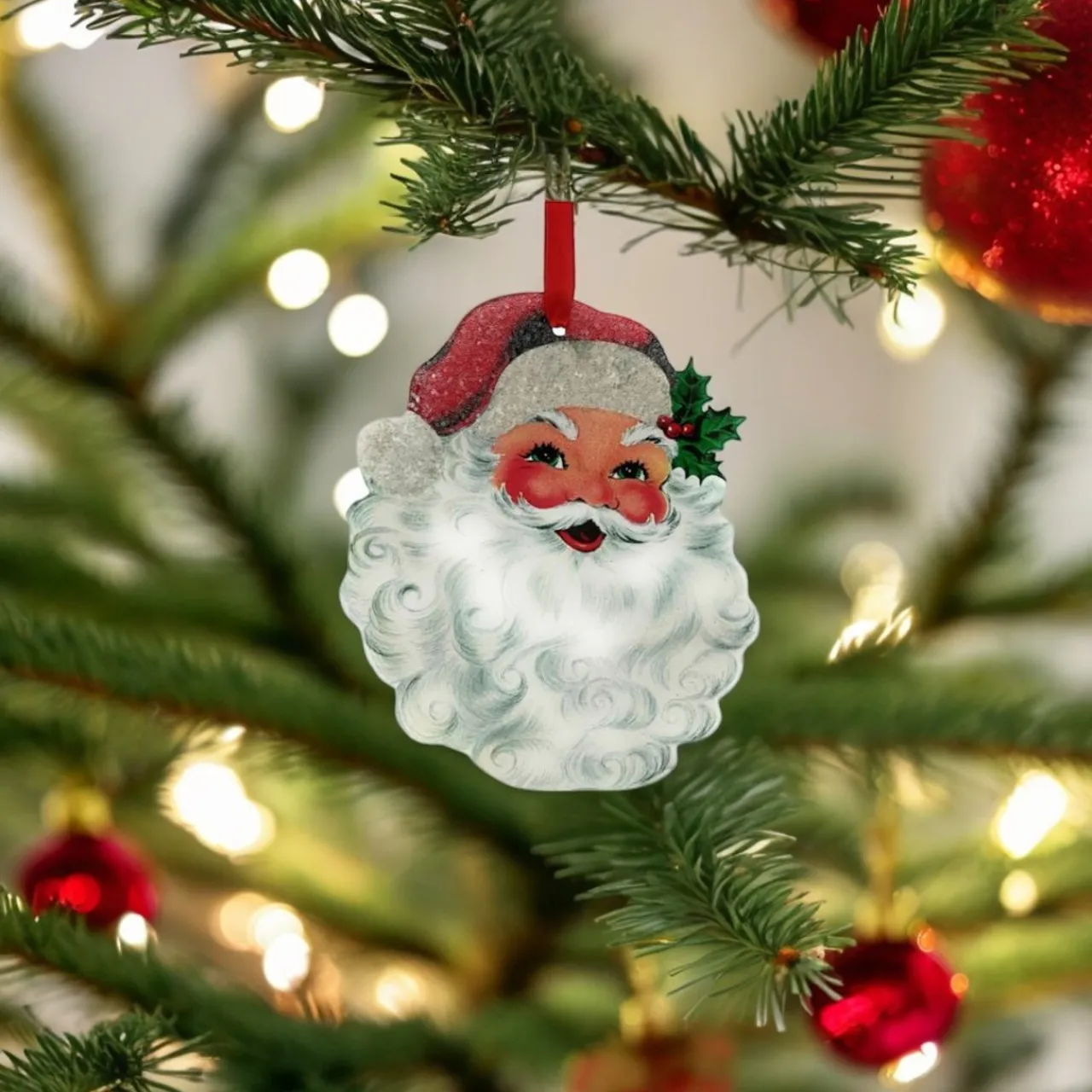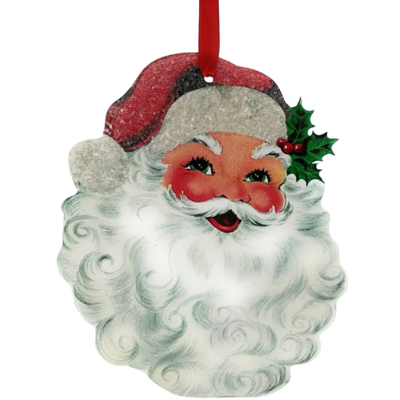 Bring holiday cheer to your home with this charming Santa Face Ornament. Featuring a jolly Santa with a rosy-cheeked smile and a festive holly accent, this ornament captures the essence of Christmas. The lightweight design and vibrant colors make it a perfect addition to your Christmas tree.