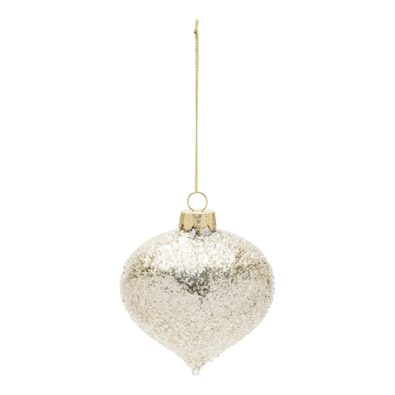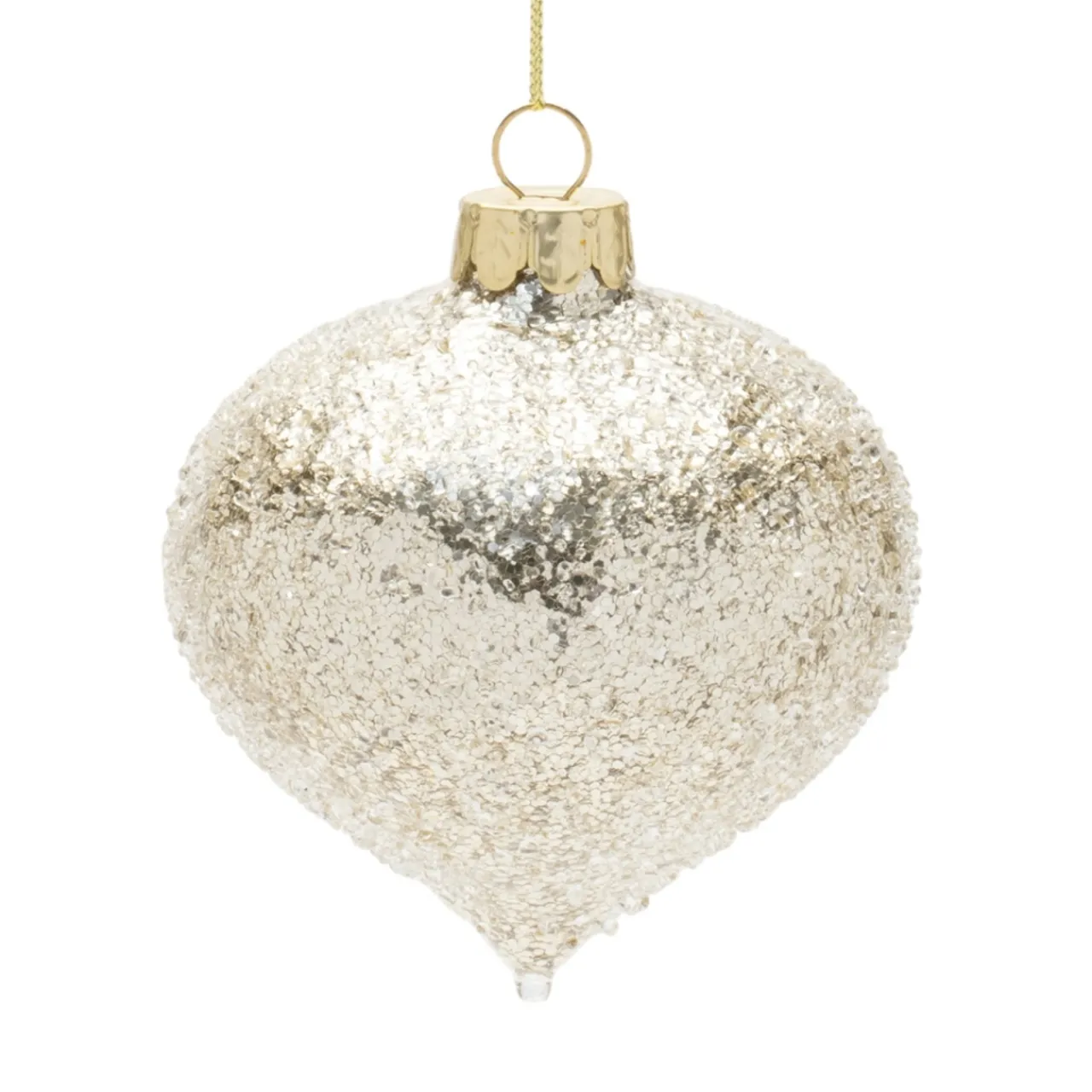 Add a touch of sparkle to your holiday décor with this elegant Onion Ornament. Made of glass and adorned with shimmering sequins, this 3.5-inch ornament catches the light beautifully, creating a festive and eye-catching effect on your Christmas tree.