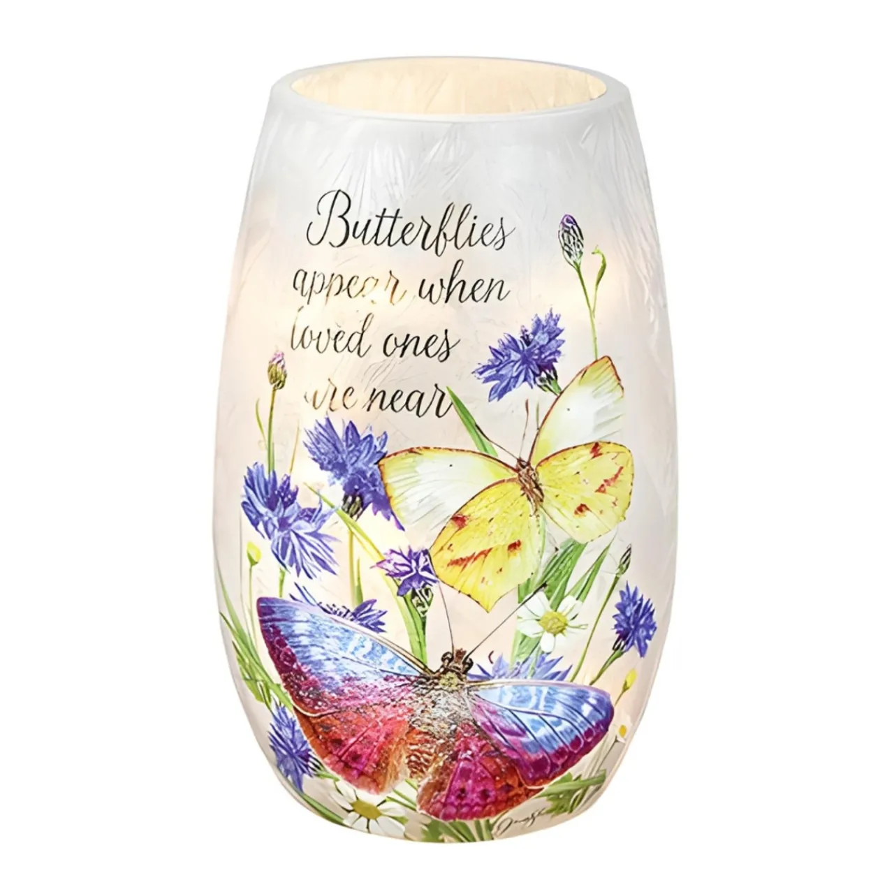 Cherish the presence of loved ones with the Stony Creek Illuminated Lighted Vase. Featuring the heartfelt phrase “Butterflies appear when loved ones are near,” this glass vase showcases delicate butterflies and vibrant blue flowers.