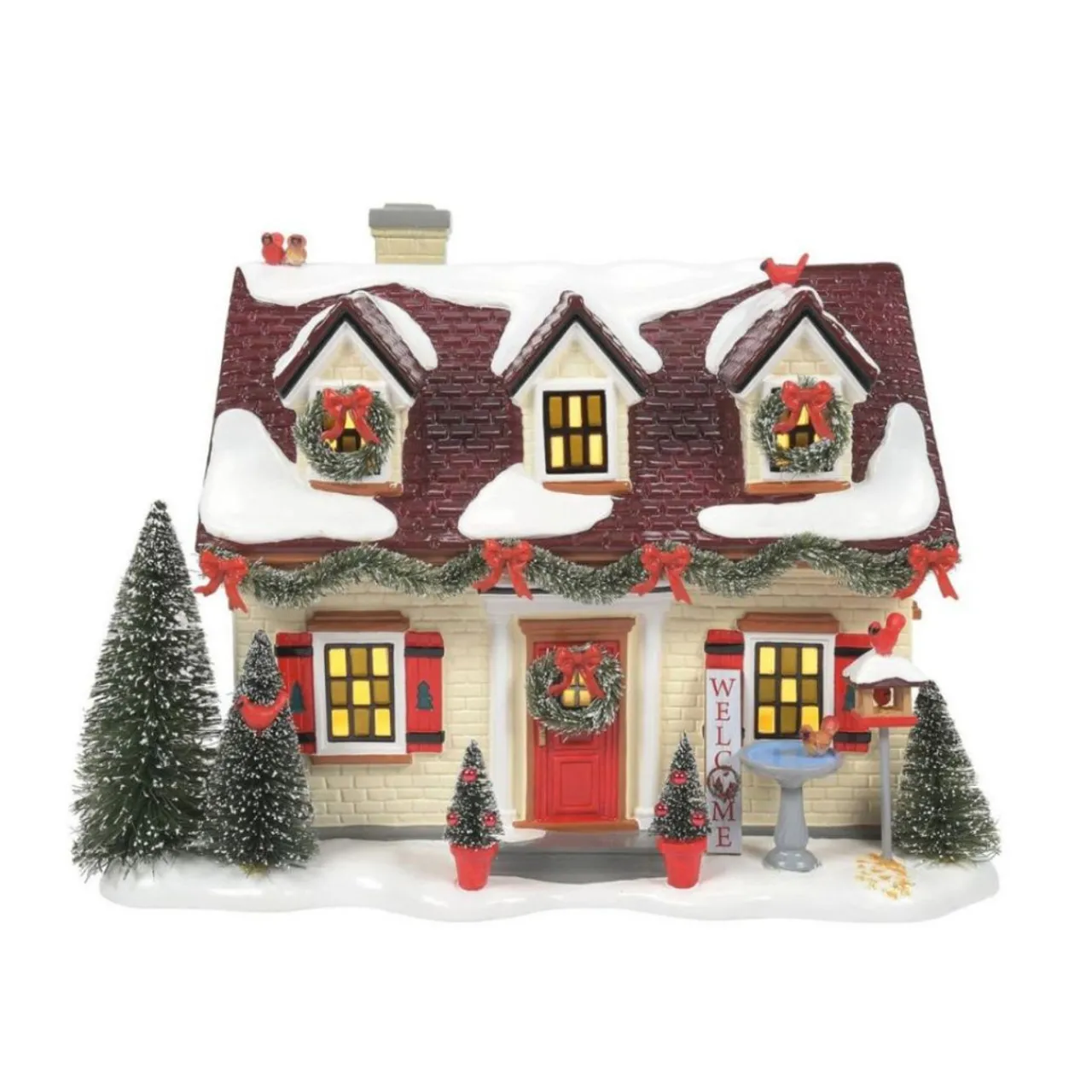 Bring a touch of holiday cheer to your Snow Village with The Cardinal House by Department 56. This charming home features snow-covered rooftops, festive wreaths, and bright red accents.