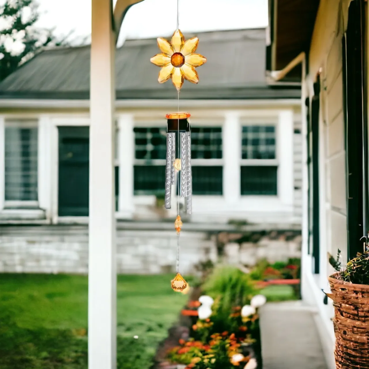 Add a touch of sunshine to your garden with our 20 inch Sunflower Wind Chime! This beautifully crafted wind chime features a vibrant sunflower top with crystal accents that sparkle in the sunlight.