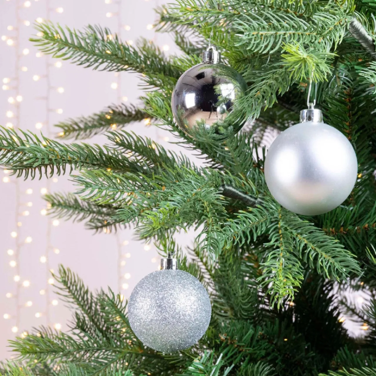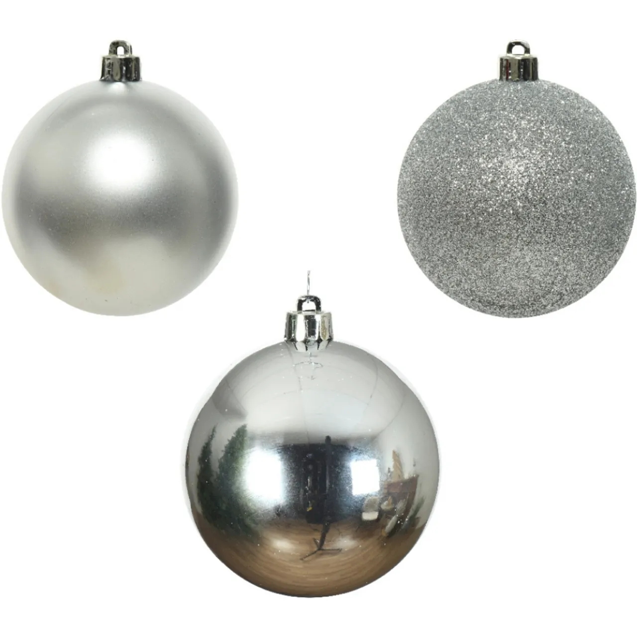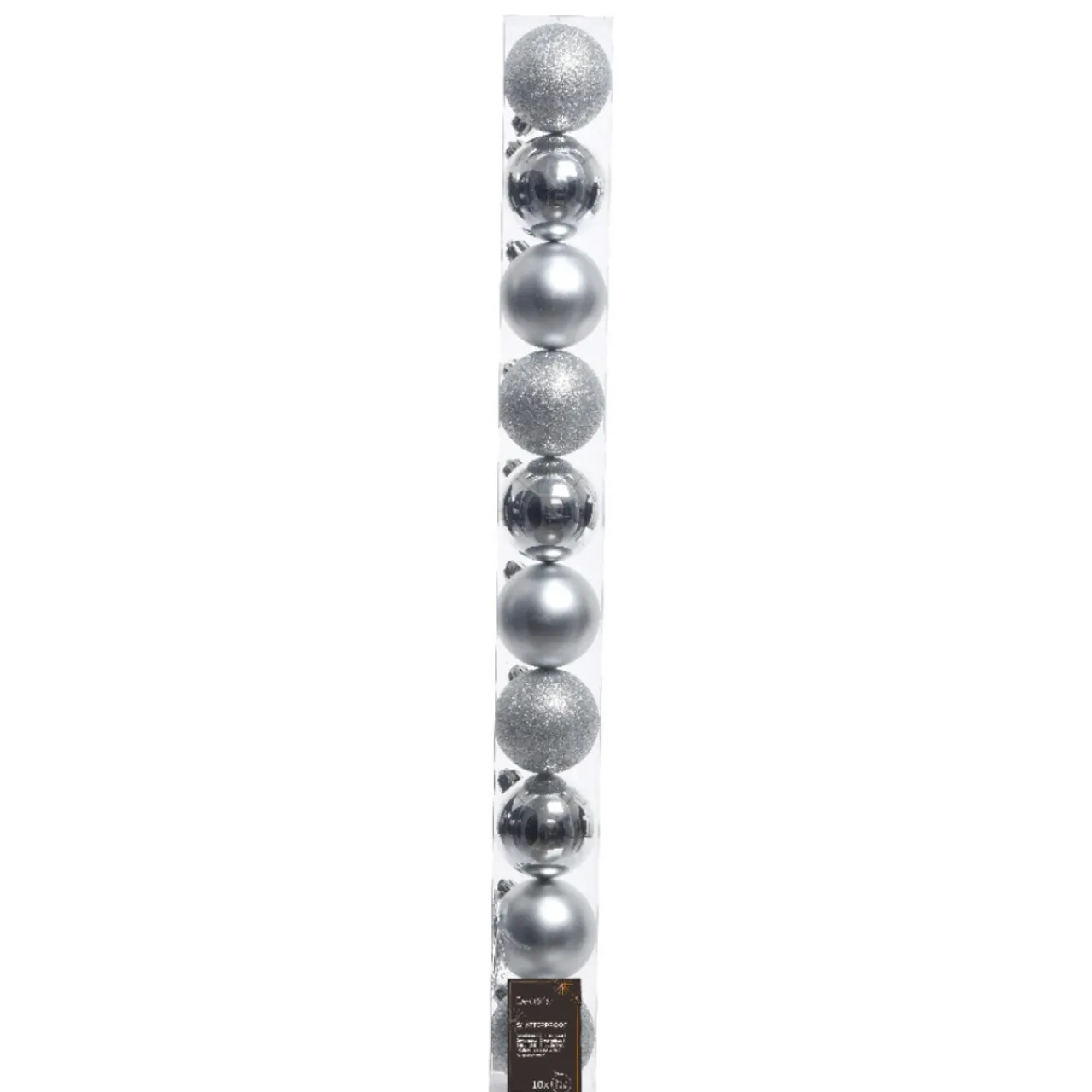 Embellish your festive setting with our tube of 10 Silver Shatterproof Christmas Ornaments, expertly curated for varied appeal. Within each tube, discover a trio of shiny and matte finishes, complemented by four sparkling glitter ornaments, ensuring diverse visual interest on your tree or display. Merging elegance with durability, these shatterproof gems promise lasting beauty for countless holiday seasons. Dive into a harmonious blend of texture and shine, and elevate your festive decor with these meticulously crafted silver treasures.