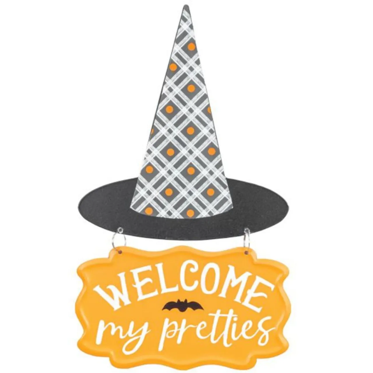 Do you dare to enter a witches home? Greet your guests with this fun witches hat hanging wall sign.