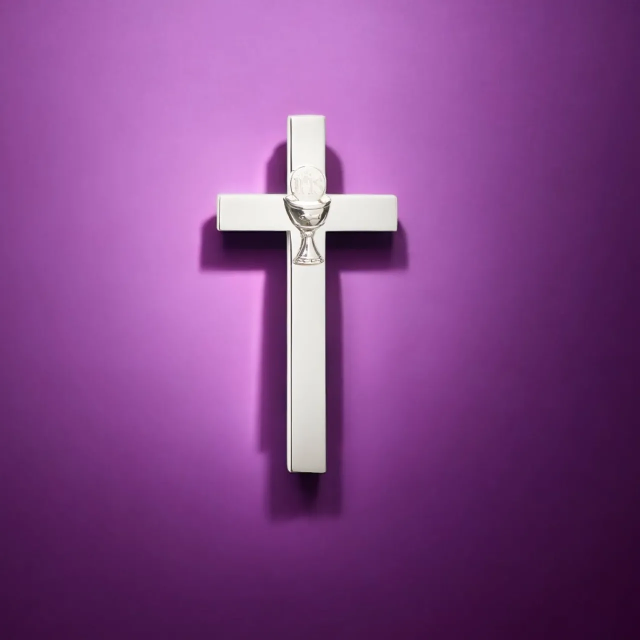Celebrate a special milestone with this 1st Communion Cross. Crafted with a sleek, polished finish, this elegant cross features a chalice and host emblem, symbolizing the sacred sacrament.