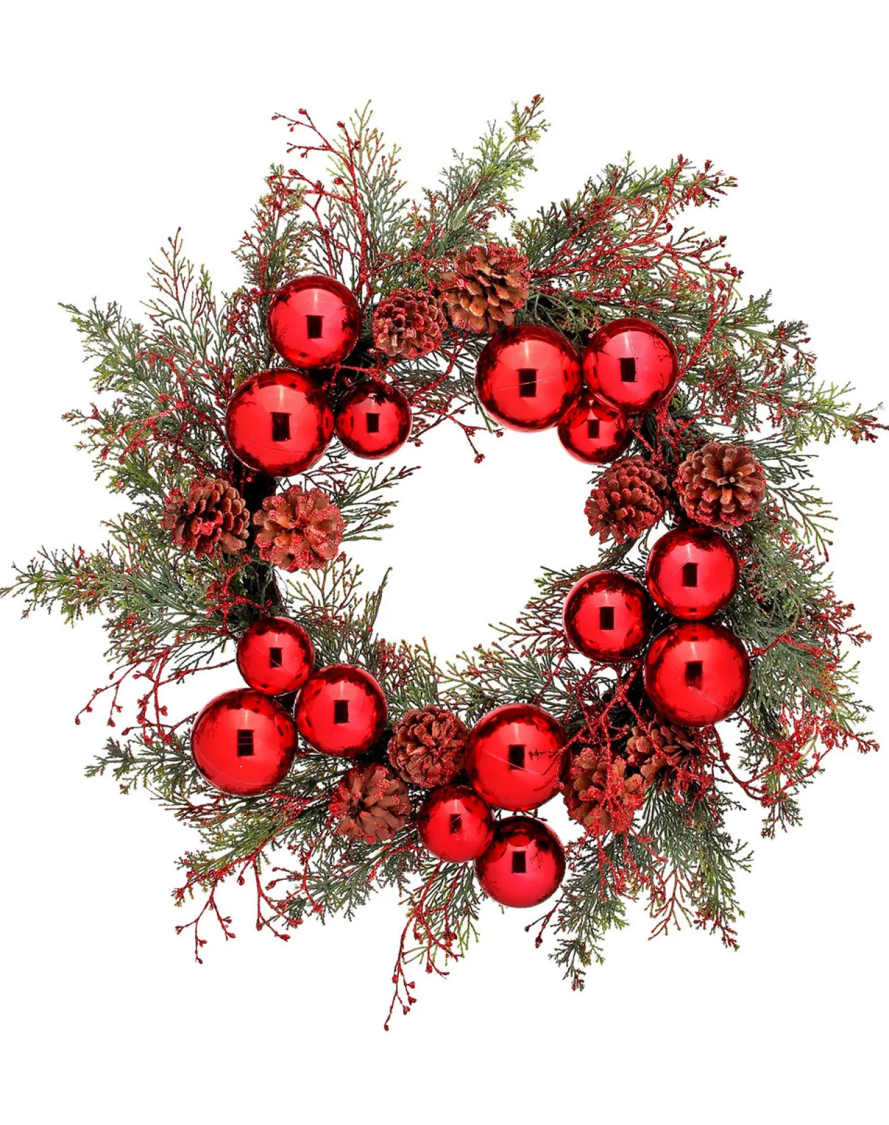 - 24″ Red and Green Glittered Cedar with Balls and Cones Wreath