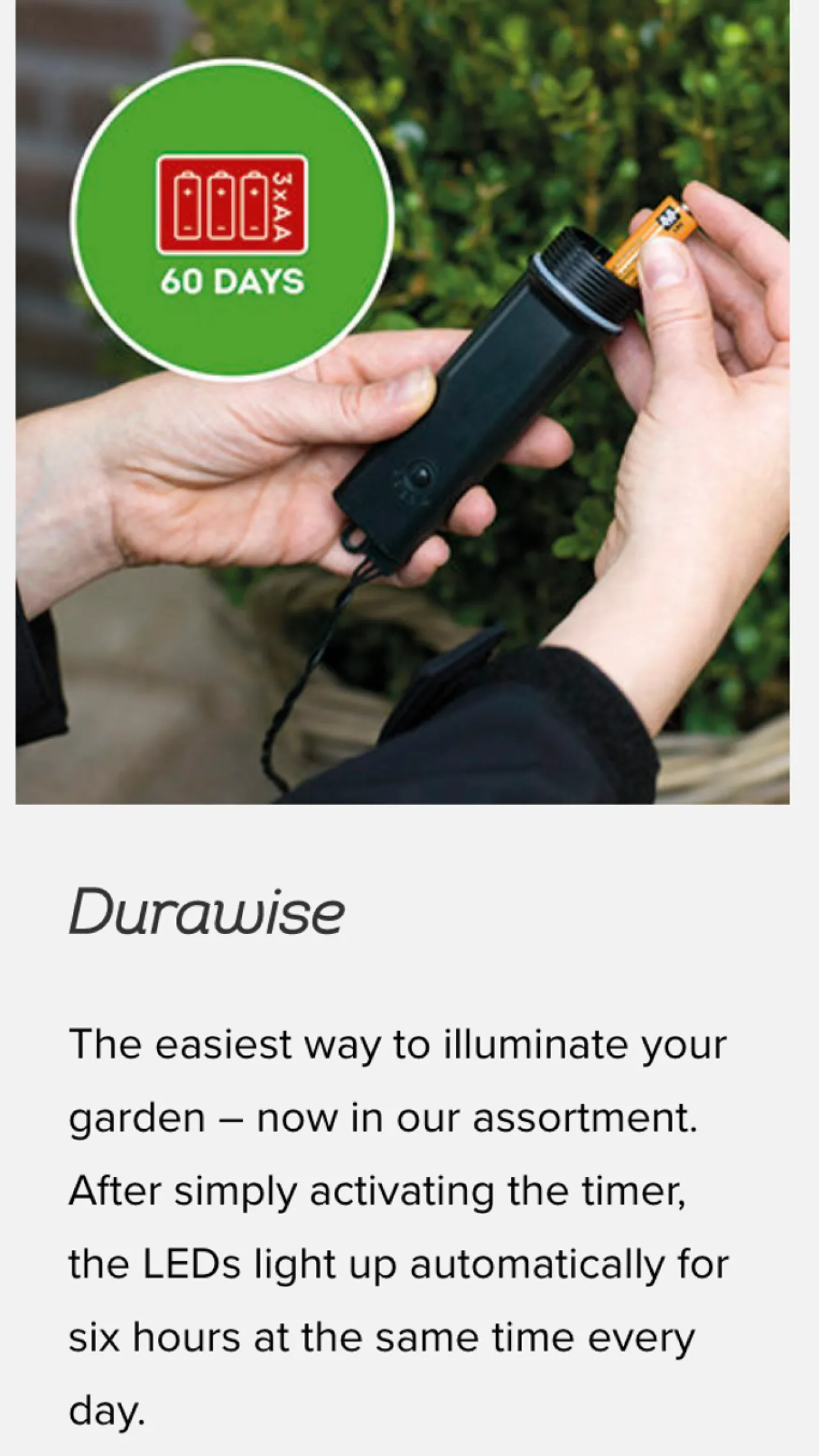 - Lasts up to 60 days with a fresh set of batteries when using the timer function