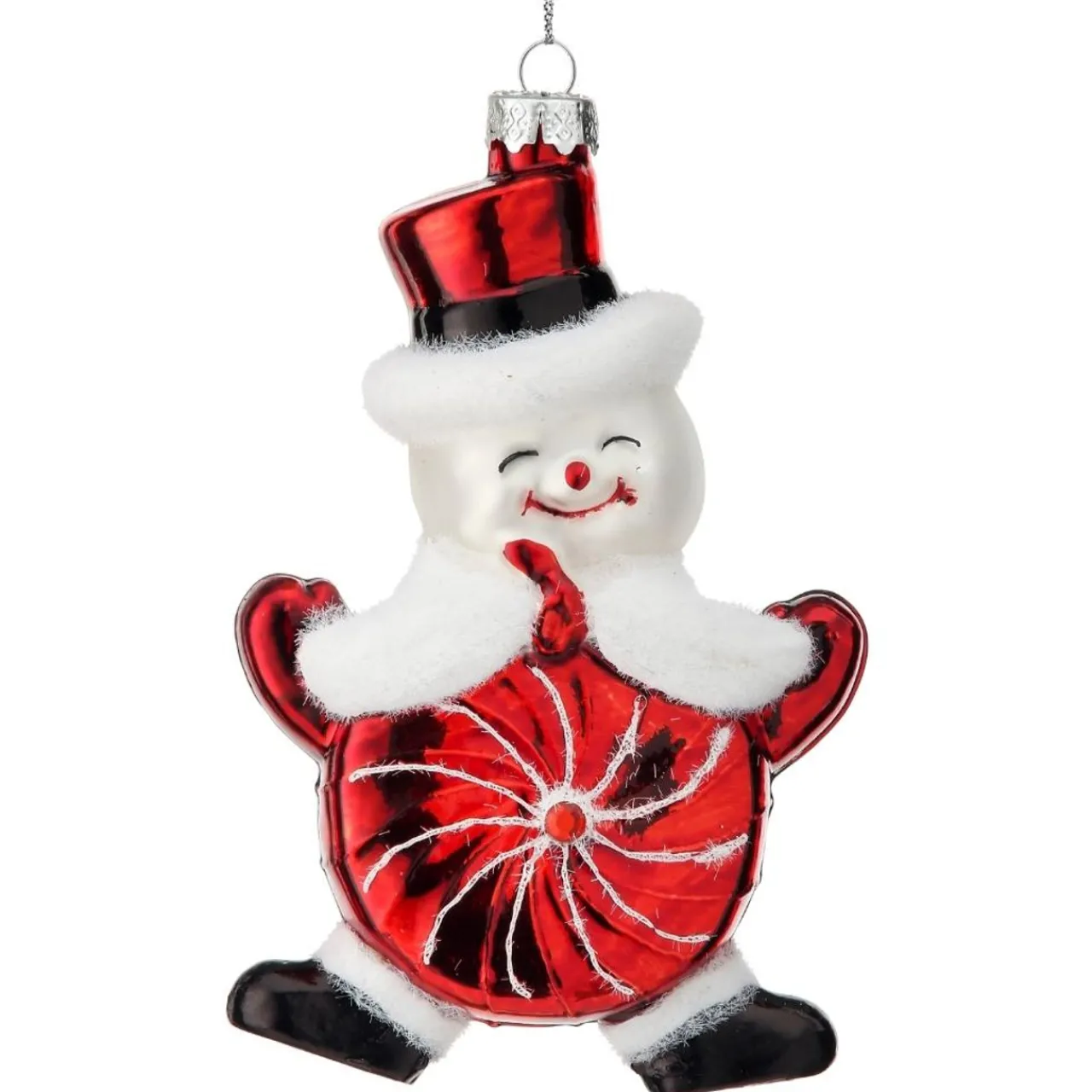 This fun candy theme decoration makes a great gift idea to bring a smile to someone’s face. The design features a snowman with a red pinwheel mint candy body and a shiny red top hat with a blue band. All sides are fully detailed, including the mint candy which has the same details on the sides and back too.