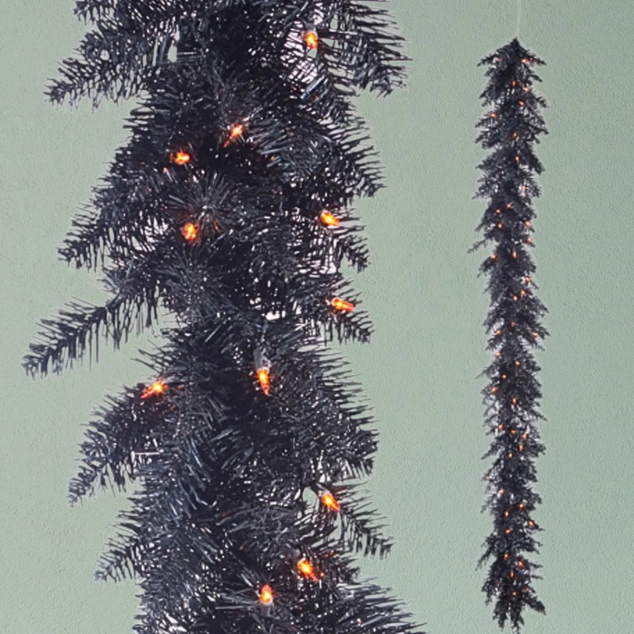 Spook up your Halloween décor with this 6′ Pre Lit Black Tinsel Garland. Featuring eerie orange lights woven through lush black tinsel, this garland is perfect for draping over mantels, doorways, or banisters.
