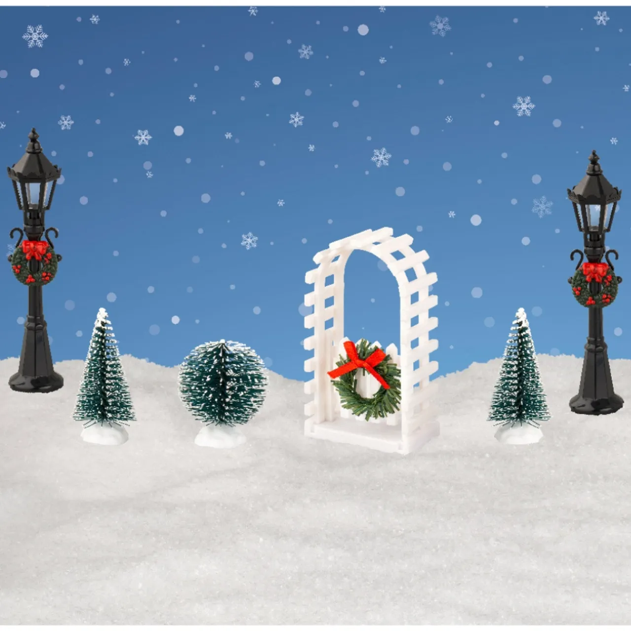 Enhance your Christmas village with our delightful 6-piece accessory set. Each set features essential elements: 2 charming lamp posts, an elegant trellis, and 3 lifelike trees. Elevate your holiday display with these intricately designed pieces, adding an enchanting touch to your festive scene. Perfectly curated, this accessory set brings the magic of the season to life in your cherished Christmas village.
