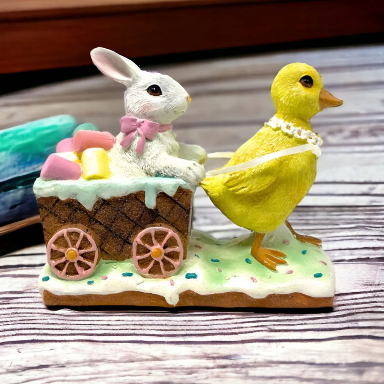 Flawlessly painted with soft pastels, this 7″ resin bunny and duckling in a cart makes a charming Spring statuette. Show off alongside your Easter decorations and enjoy for years to come. Brighten a friend’s day and give it as a thoughtful gift.