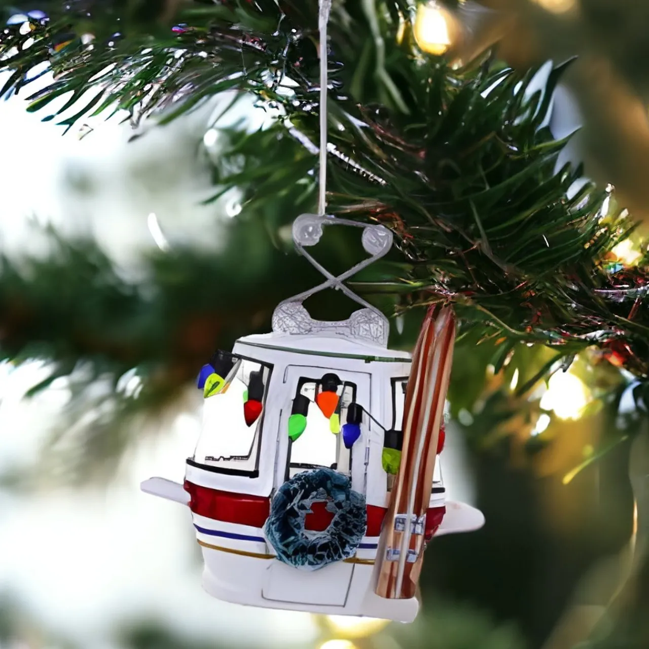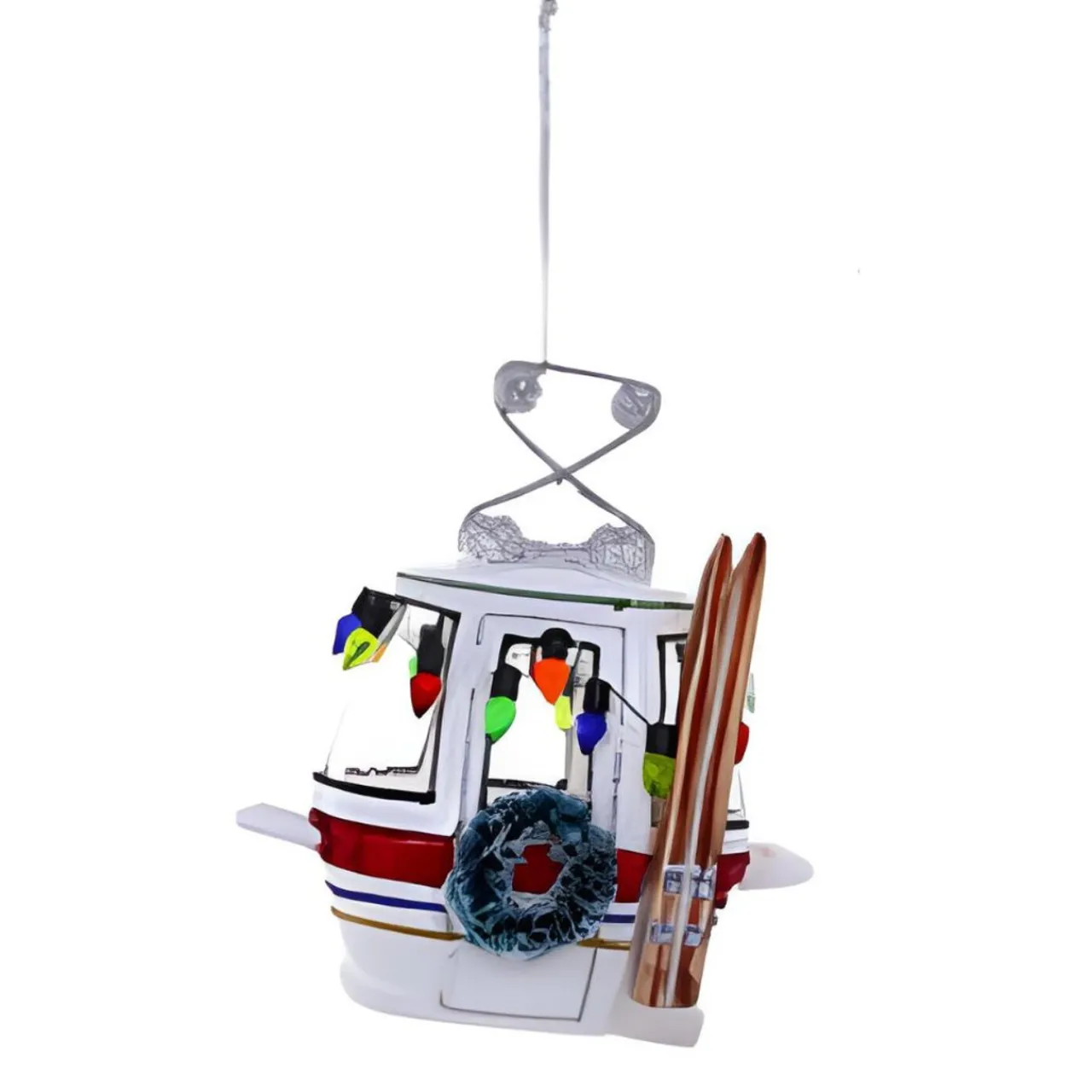 Escape to the mountains with our Alpine Silver Ski Slope Gondola Ornament. This miniature marvel, complete with skis and poles, is ready to whisk you away to snowy peaks.