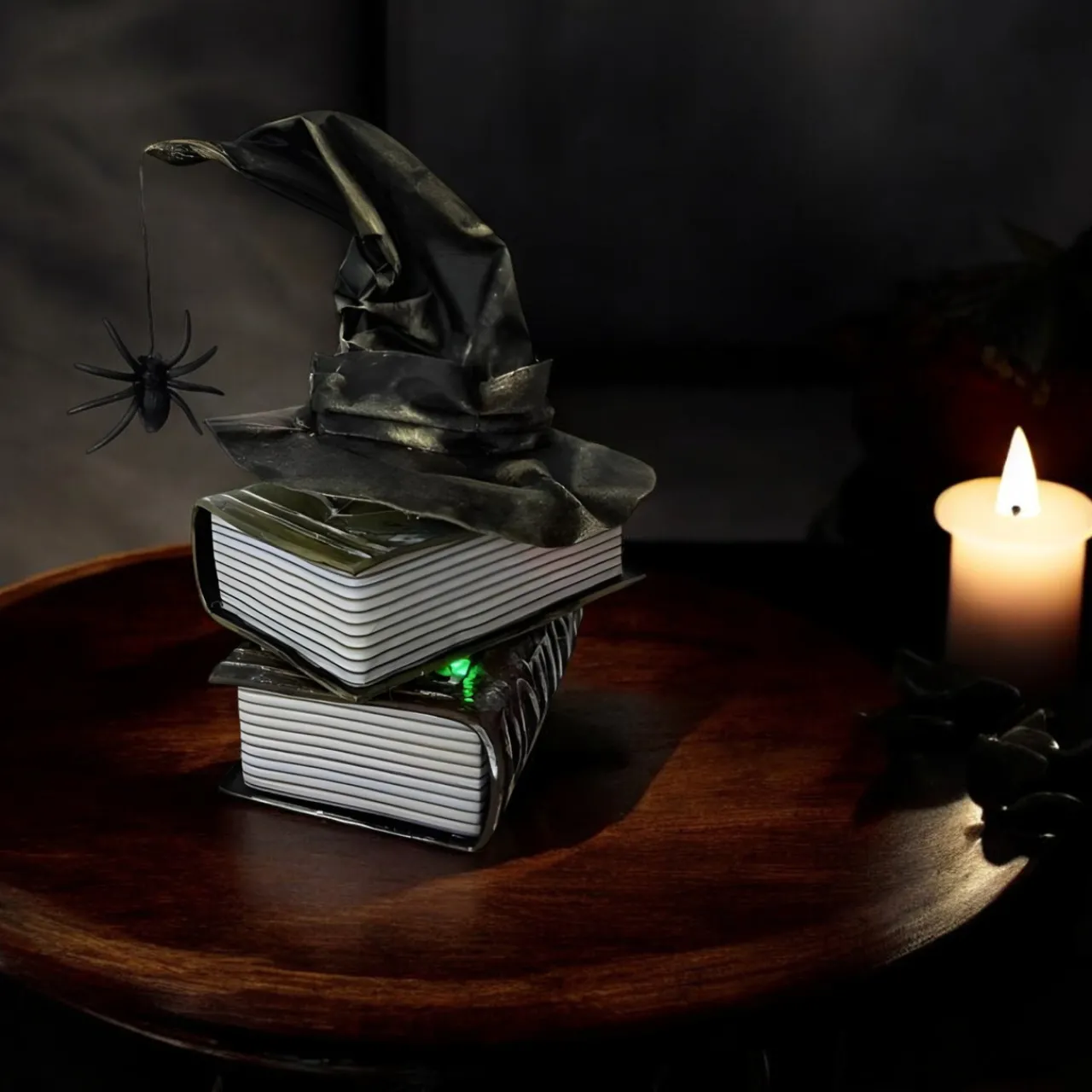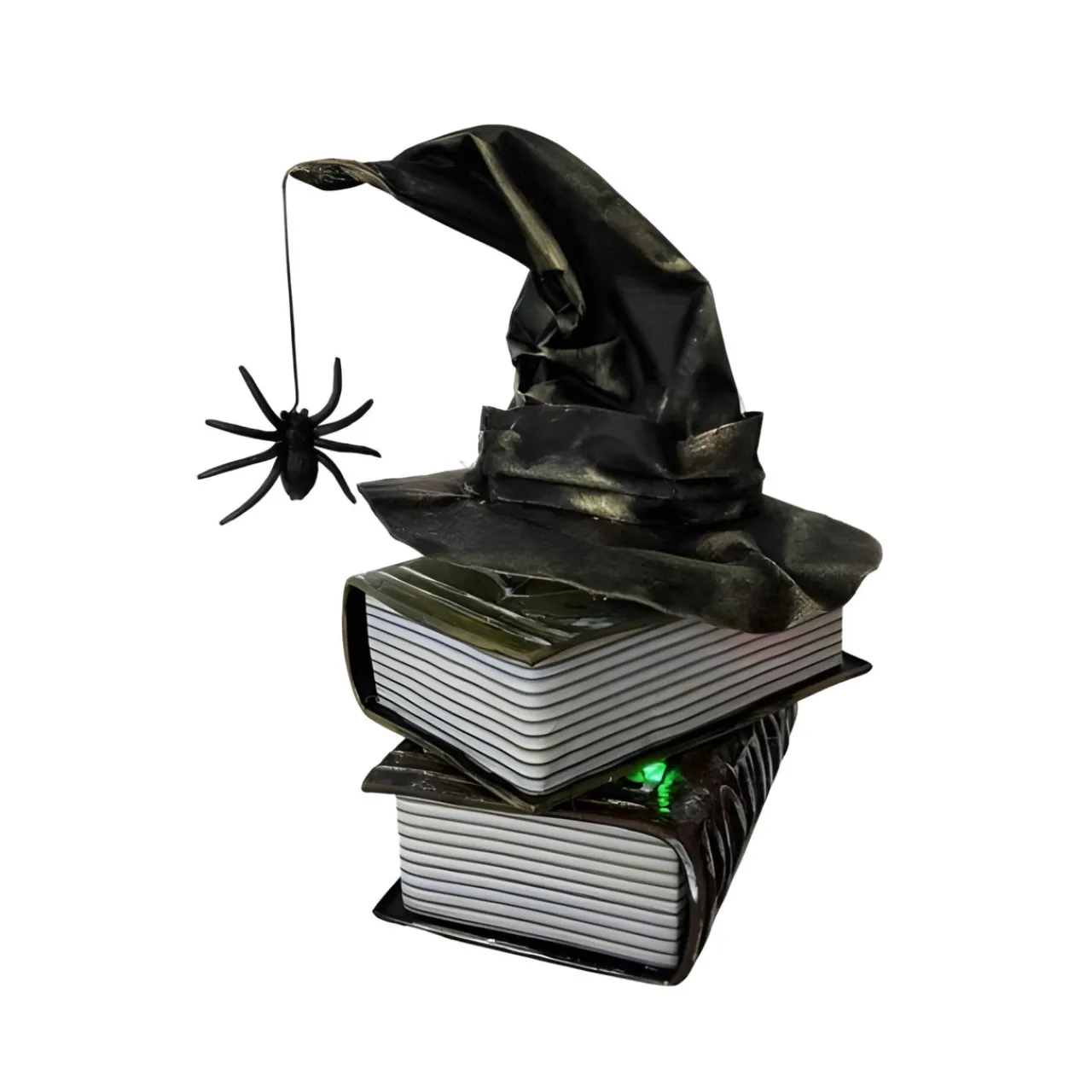 Bring spooky vibes to your home with this Animated Witch Hat on Books Tabletop Figurine! The hat spins while emitting eerie sounds and lights, perfect for creating a magical atmosphere. Standing 6.5 inches tall, it’s sound-activated and runs on 3 AAA batteries (included).