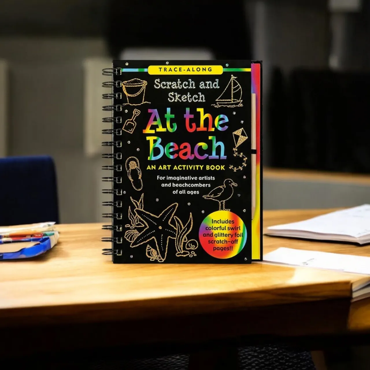 Scratch off the pages to reveal vibrant swirl patterns and glittery foil accents. Its compact spiral-bound design makes it ideal for travel or at-home fun. The wooden stylus is shrink-wrapped with the book.