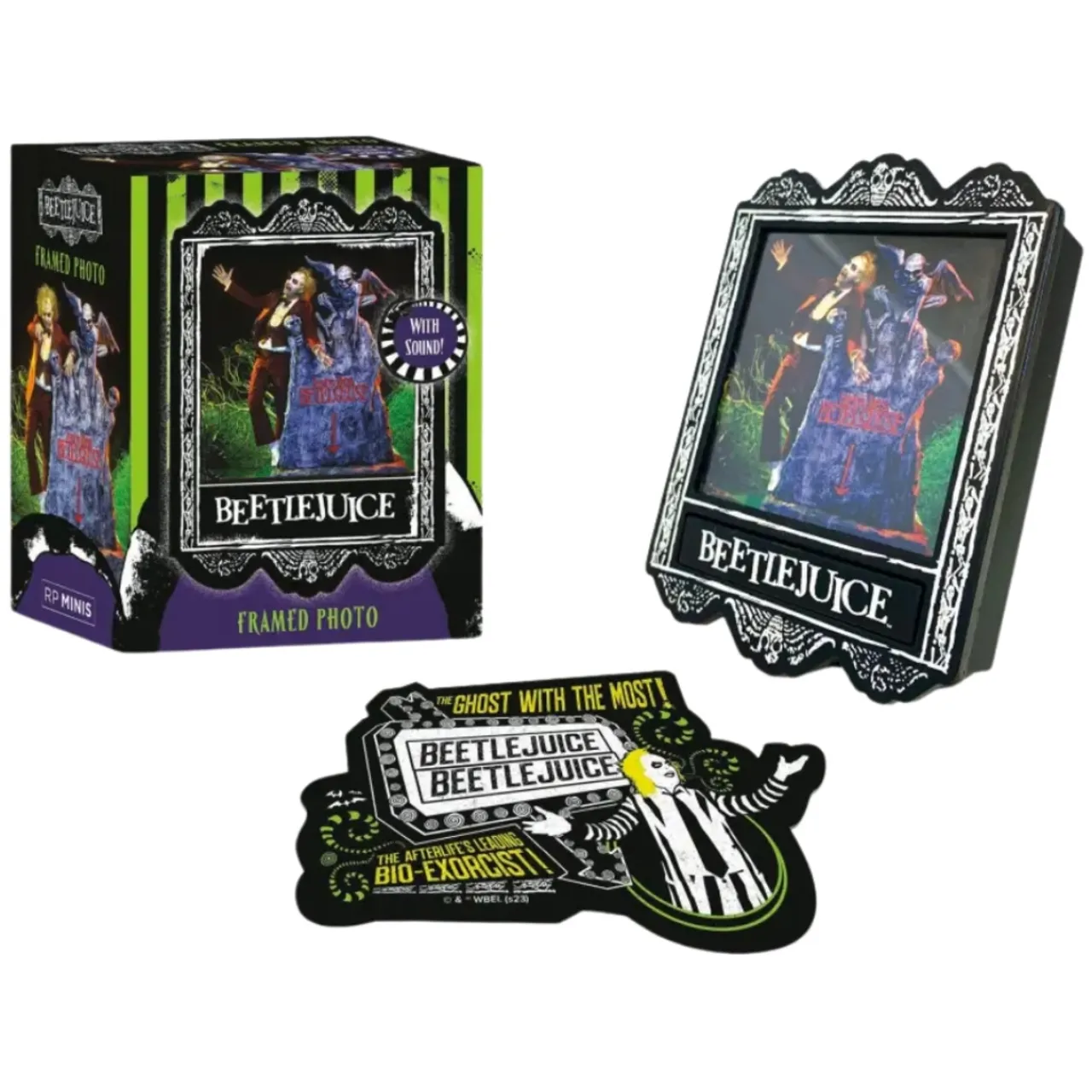 Say his name three times and bring the chaos of Beetlejuice to your shelf! This 3.5-inch framed photo features the mischievous bio-exorcist in action and plays 8 iconic lines from the cult classic movie at the press of a button. It comes with a fun bonus magnet featuring Beetlejuice’s unforgettable flair.