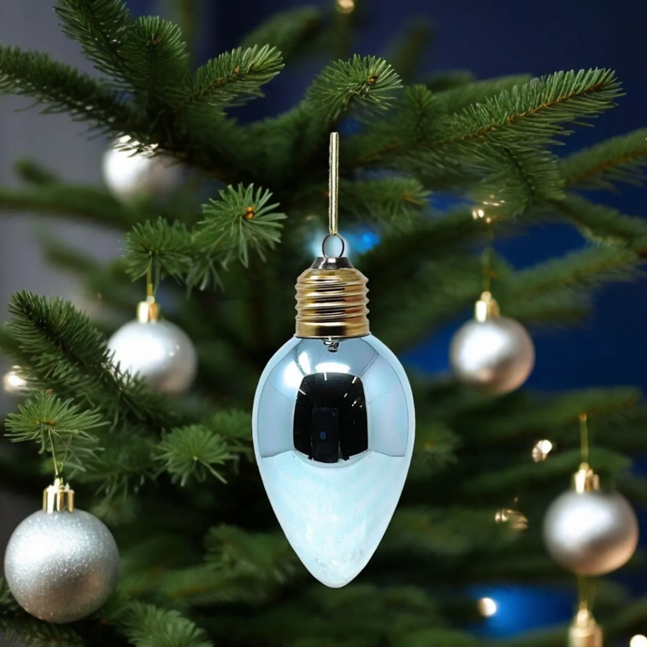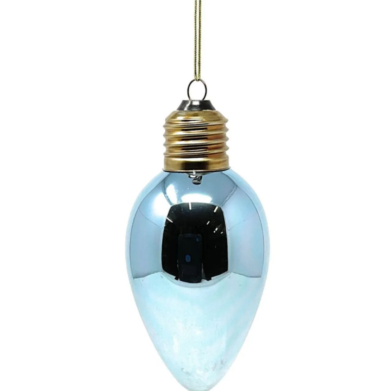 Brighten up your holiday season with this Blue Light Bulb Ornament. Crafted to resemble a classic Christmas light bulb, this ornament features a shiny blue finish that catches the light beautifully. Made from durable materials, it includes a gold string for easy hanging.