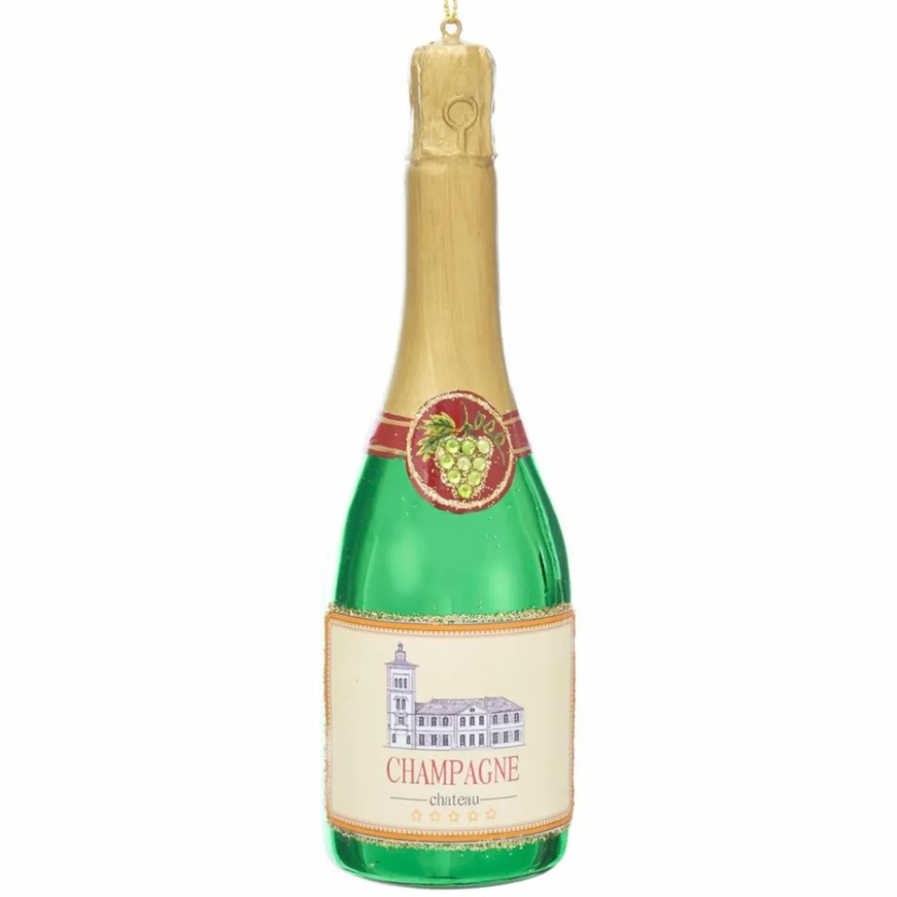 The glittered accents add a touch of glamour and shine, making this ornament a true standout piece. Measuring 6 inches in size, this ornament is perfect for larger trees or as part of a centerpiece or decorative display. The included gold string allows for easy and convenient hanging, ensuring that you can enjoy this beautiful ornament throughout the holiday season. Whether used as a standalone ornament or as part of a larger display, our Glass Champagne Bottle Ornament is sure to add a touch of sophistication and style to your holiday decor. Order now and raise a glass to the magic of the season!