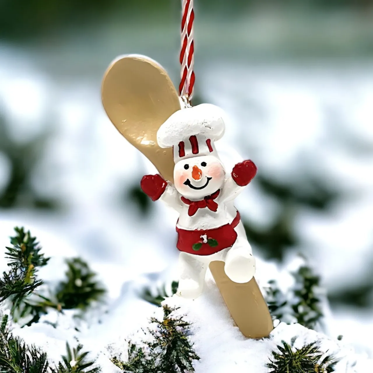 Whip up some holiday cheer with this 4.5-inch Chef Snowman with Spoon Ornament, a charming resin figurine that’s ready to stir up fun on your Christmas tree!