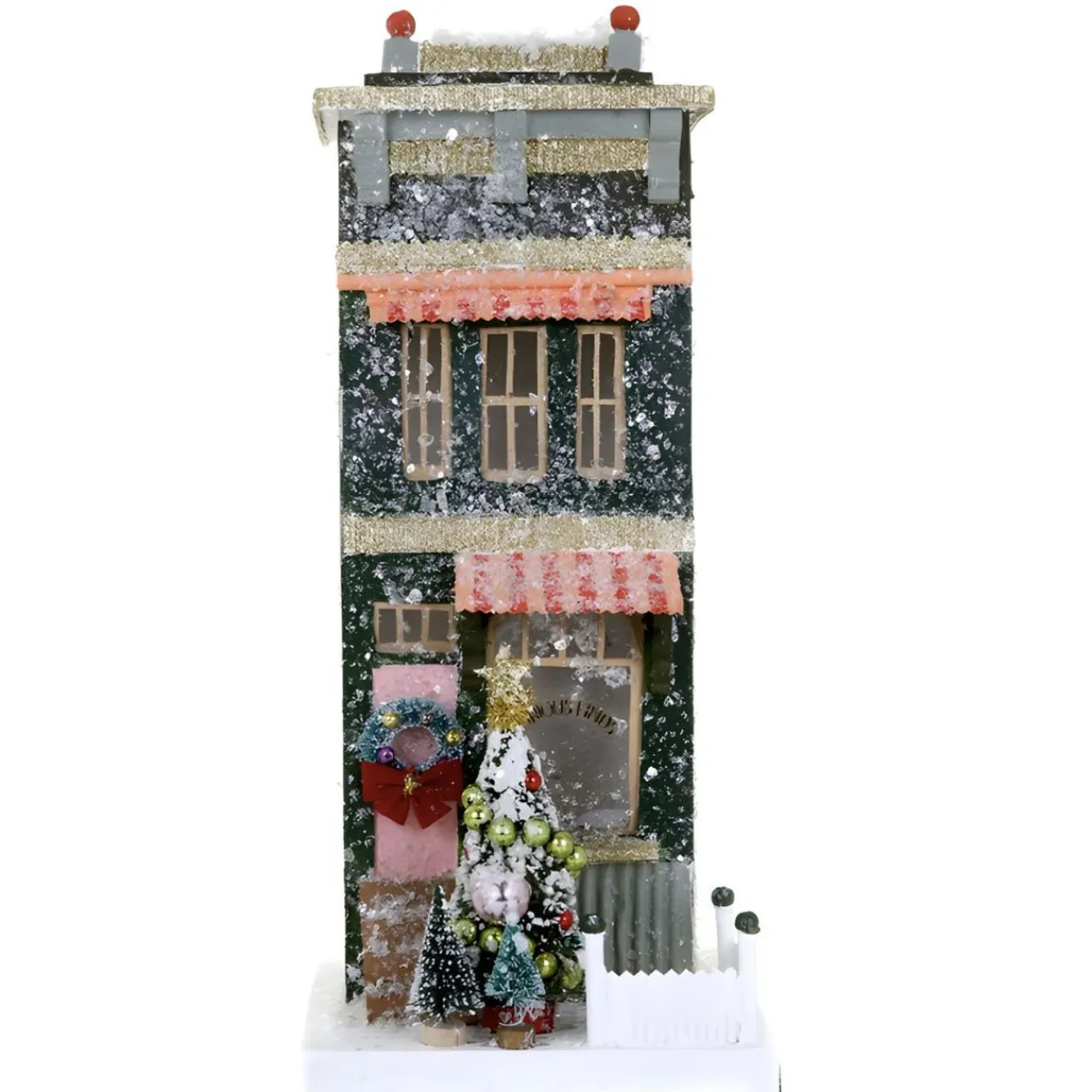 Its architectural elegance is heightened when bathed in the soft glow of a C7 light cord (available separately) through an expertly designed hole at its back. With a delicate dusting of fresh snow atop its roof and chimneys, the Antique Shop is destined to be the centerpiece of your mantle display or a standout in your holiday village scene under the Christmas tree.