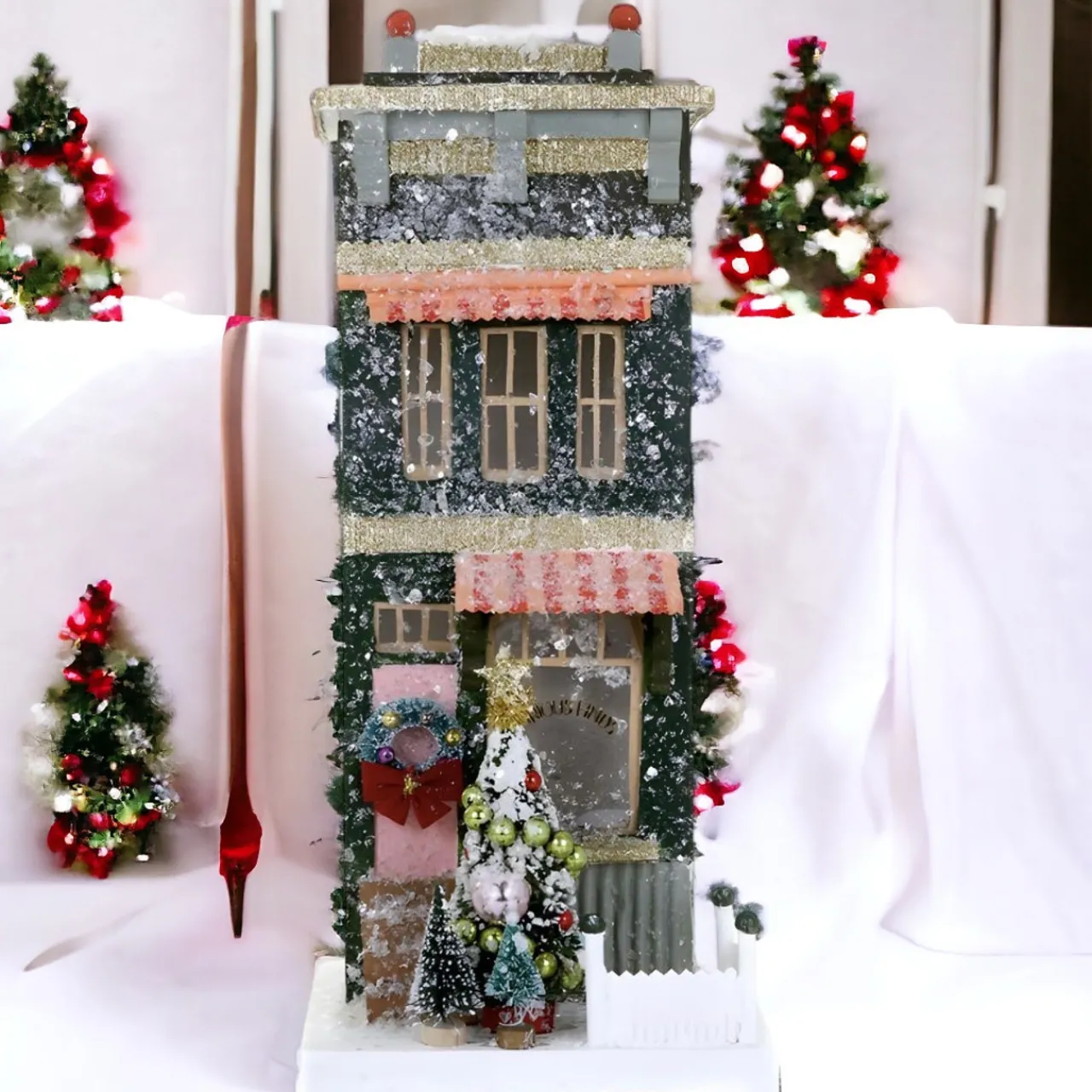 Every corner of this hand-painted and hand-decorated holiday haven glistens with an opulent glitter overlay, complemented by intricate bottle brushes, shimmering beads, and festive adornments, notably a celebratory wreath.