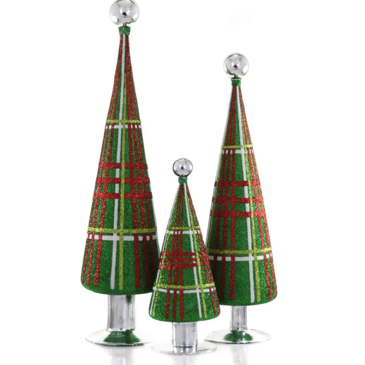 Bring bold holiday charm to your décor with the Cody Foster Glitter Plaid Tree Set in Green. This set of three cone-shaped trees features vibrant green glitter with classic red, white, and green plaid striping, topped with gleaming silver orbs.