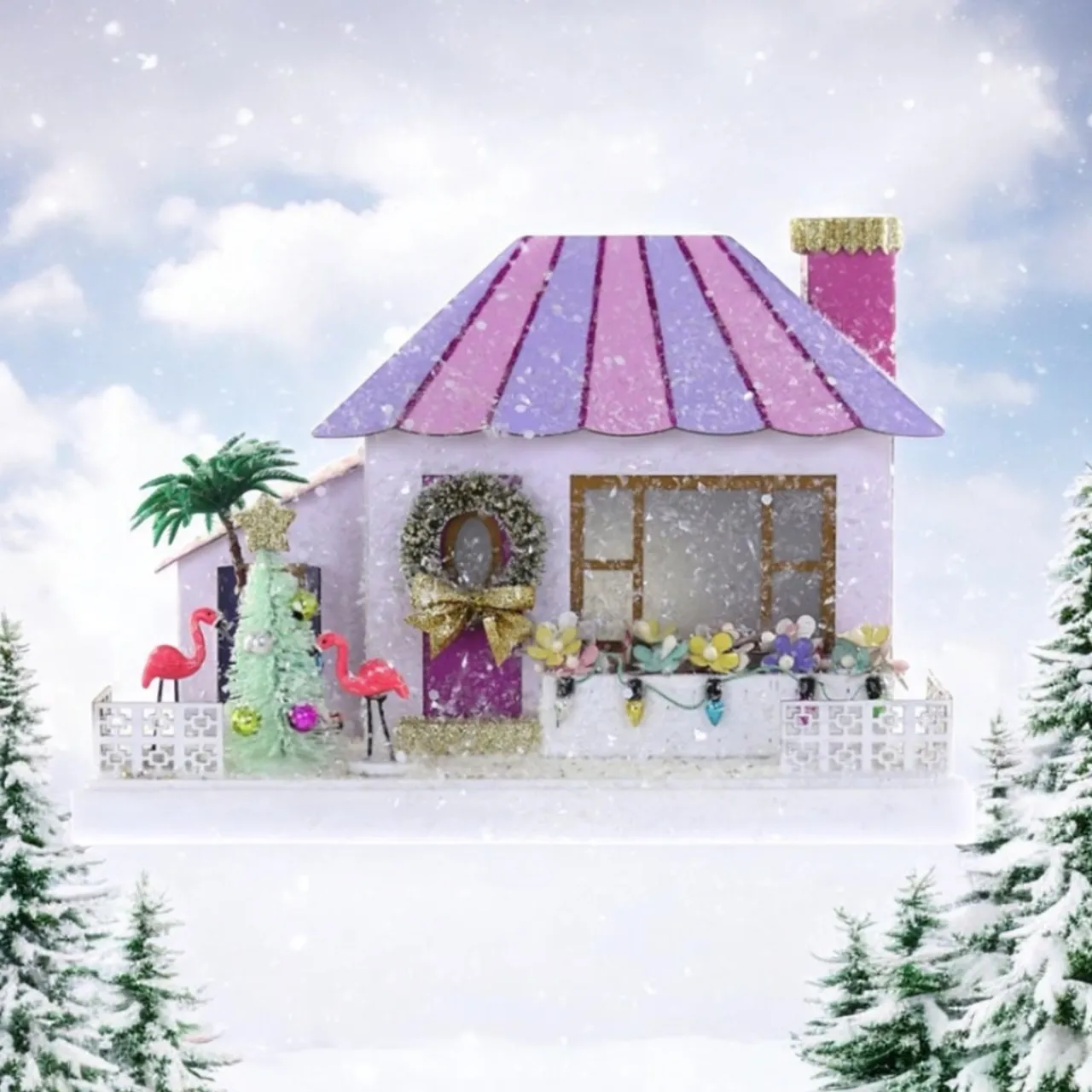 Bring tropical vibes to your holiday décor with the Cody Foster Purple Palm Springs House! This pastel dream features a bold pink roof, bottle brush tree, and festive flamingos all dusted with snow.