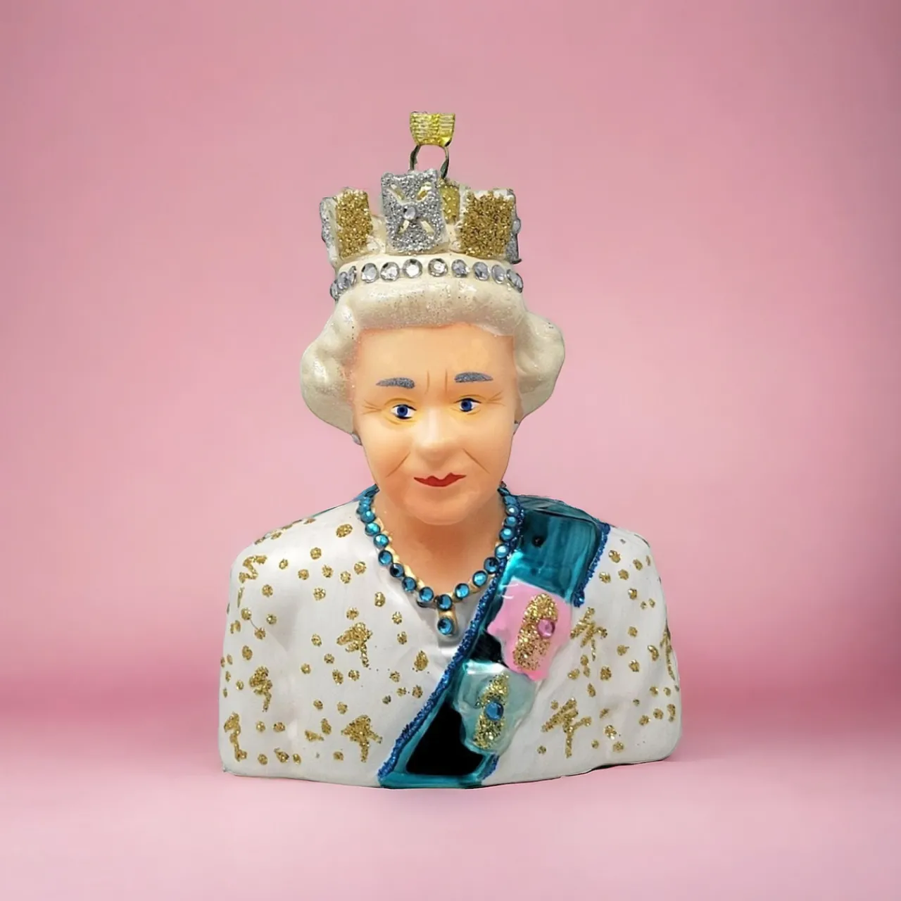 This Cody Foster Queen Elizabeth II Ornament captures the royal in all her splendid regalia, from her blue sash, or riband, with Royal Family Orders to her glorious gold studded dress and glittery jeweled crown.