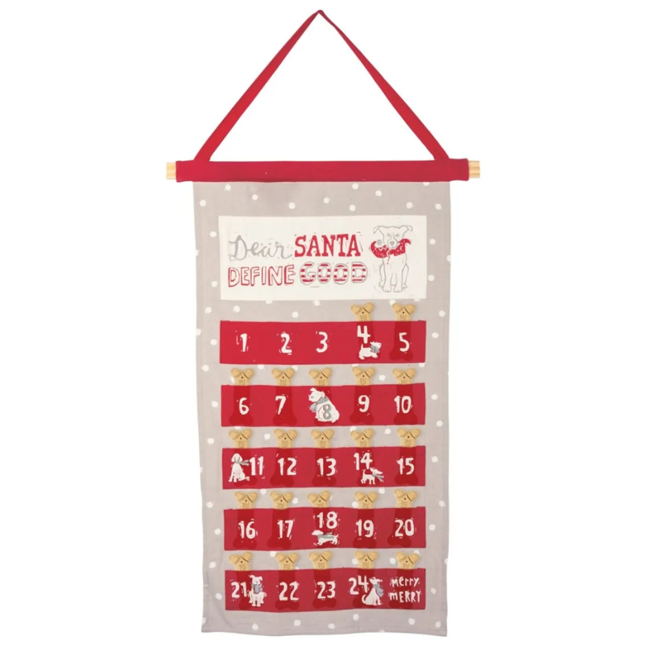 Get your furry friend in the holiday spirit with our Dear Santa Define Good Puppy Christmas Countdown. This fabric advent calendar is adorned with charming dog-themed designs, numbered pockets for daily countdown fun, and a convenient fabric loop for easy hanging. Fill it with treats to share the joy with your pup!