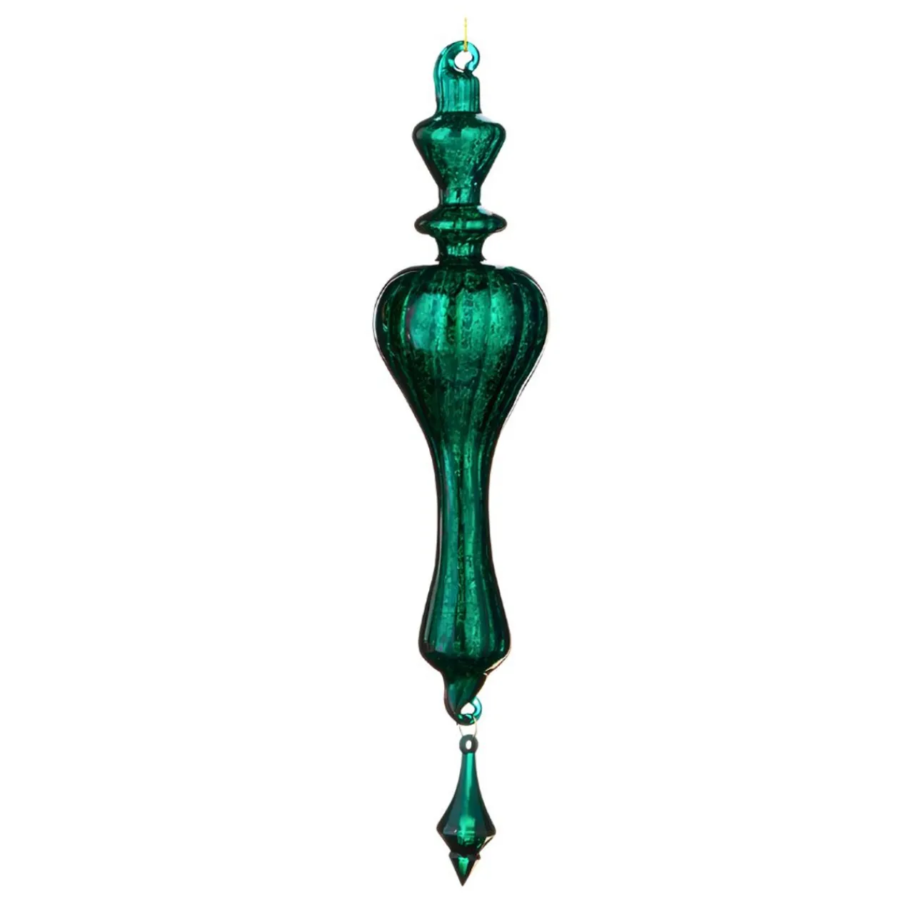 This stunning ornament features a unique finial shape with a vibrant emerald green color that adds a touch of elegance and sophistication to any holiday display. The ornament is made of high-quality glass and is approximately 10 inches in length, making it a standout piece on your Christmas tree.