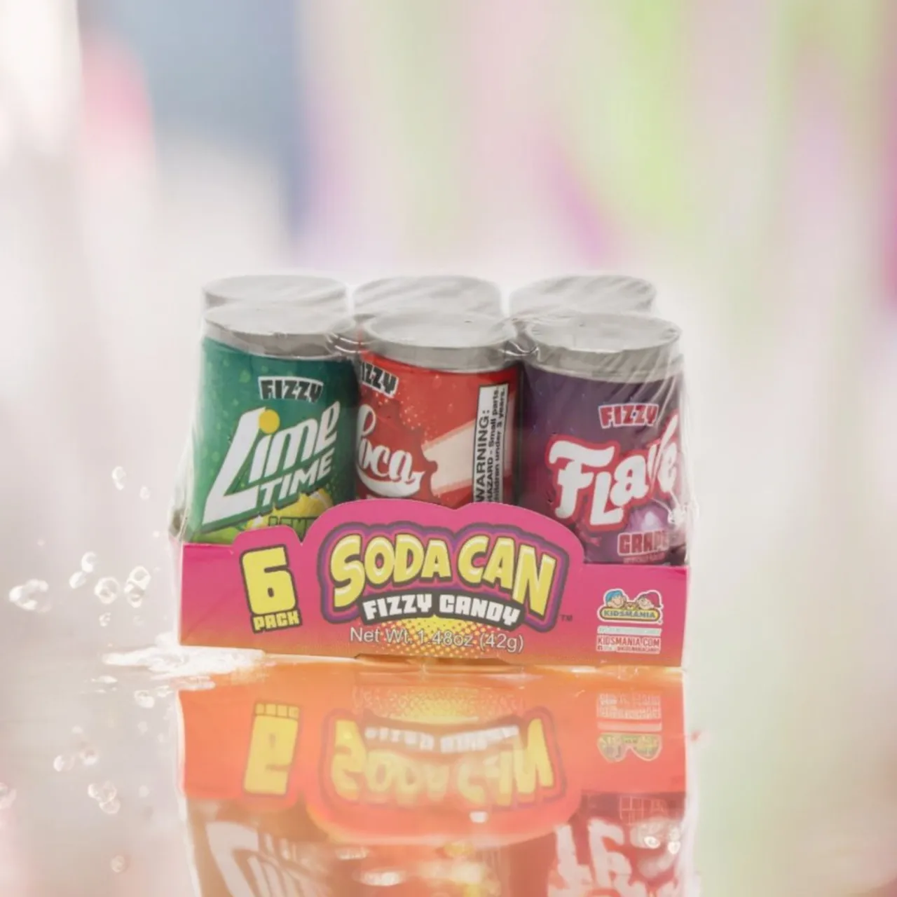 Pop open some fun with our Fizzing Soda Cans Candy Pack! Each pack contains six mini cans, each bursting with its unique fizzy flavor: Lime Time, Loca Cola, and Grape Flash.