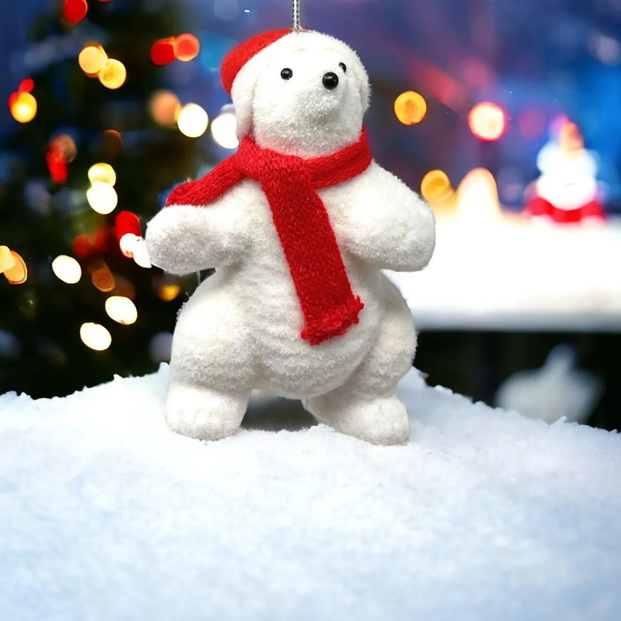 Our polar bear is dressed for the season in a cheerful red scarf and a cute Santa hat, bringing a playful and festive spirit to your home. The flocked coating gives it a soft, snowy texture that feels just like a winter wonderland.