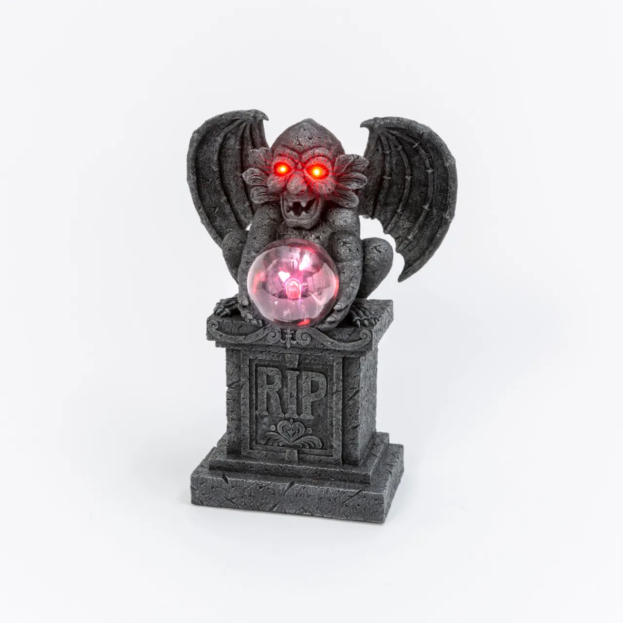 Many considered gargoyles the spiritual protectors of churches as well, scaring off demons and evil spirits. Here is one perched on top of a gravestone. Its eyes glow red and the globe illuminates light from it.
