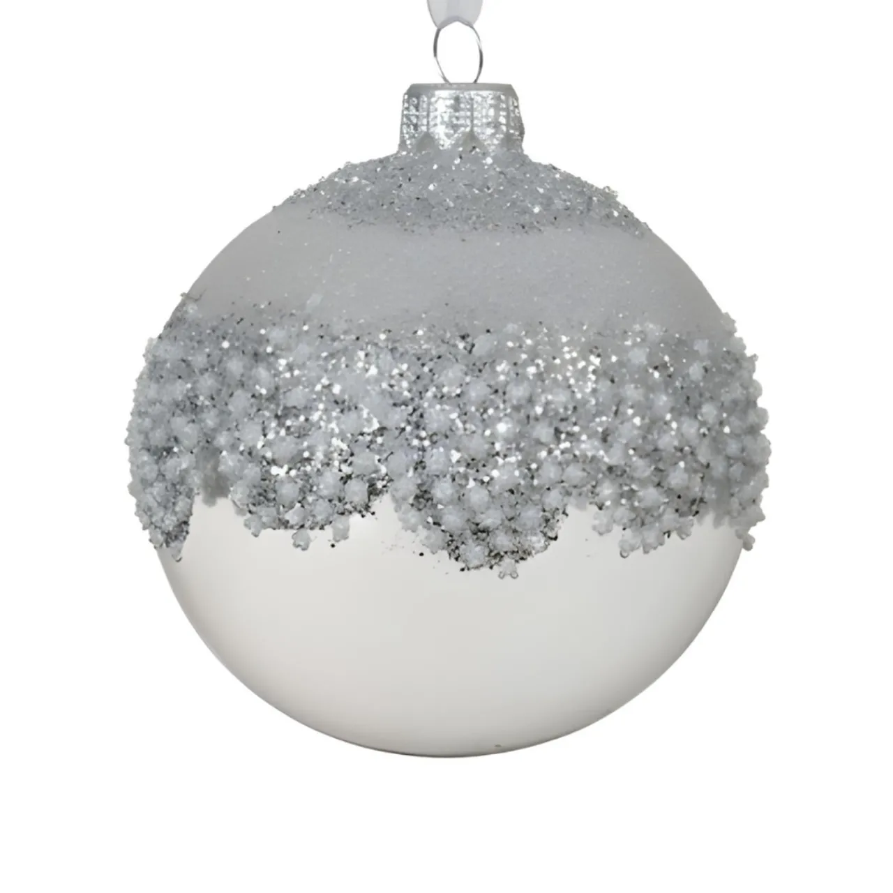 Elevate your holiday decor with this stunning glass ball ornament featuring a silver glittered cluster design. Measuring 3 inches in diameter, this exquisite ornament is crafted from high-quality glass and adorned with intricate glitter clusters that sparkle beautifully in the light.