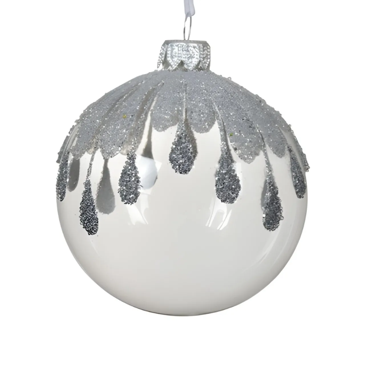 Add a touch of elegance to your holiday decor with this stunning glass ball ornament adorned with silver glittered tear drops. Measuring 3 inches in diameter, this exquisite ornament is crafted from high-quality glass and features intricate glitter designs that catch the light beautifully.